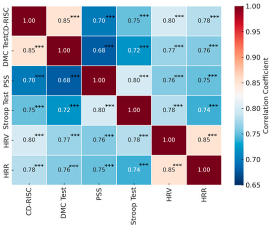 The heatmap of the correlation matrix indicates that improvements in one area tend to be associated with improvements in the other measures. In particular, increases in SDNN and RMSSD and a decrease in the LF/HF ratio were associated with improvements in resilience and decision-making competence, confirming the link between autonomic regulation and psychological adaptation (Figure 2).