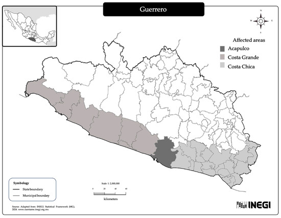 In Mexico, as in many regions across the Americas and worldwide, the frequency of high-magnitude disasters, such as hurricanes and earthquakes, has been increasing, resulting in significant socioeconomic impacts and substantial losses [20]. On October 19, 2023, the population along the Guerrero coast in southeastern Mexico was belatedly alerted to the approach of a major hurricane, named Otis. This event caused severe damage among vulnerable populations in Guerrero [21]. Later, in September 2024, Hurricane John made landfall in the state as a Category 3 storm, with sustained winds of up to 195 km per hour. The hurricane caused extensive destruction, including catastrophic flooding and mudslides, particularly affecting Acapulco and surrounding areas. Approximately 270,000 people were impacted, and 23 fatalities were reported [22], exacerbating existing social and health disparities in the region. Although the most severe impact was concentrated along the coast, the emergency triggered large-scale response efforts, including the distribution of over 100,000 food packages and the deployment of health mobile units providing services to the population throughout the state.