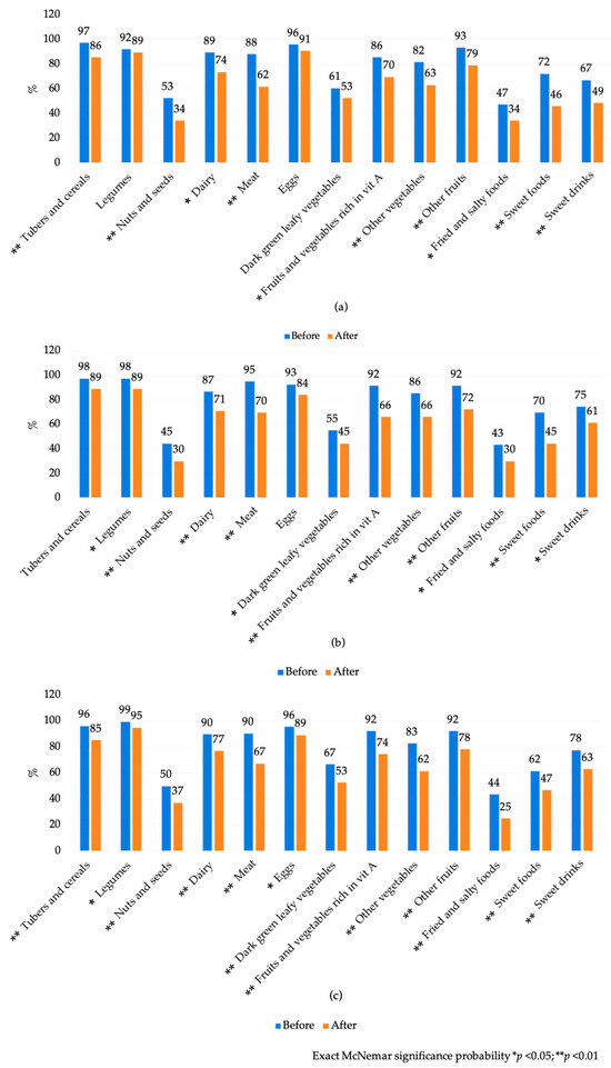 Food groups consumption among pregnant and breastfeeding women group before and after Hurricane John. Guerrero, México. 2024. (a) Consumption among pregnant women; (b) consumption among caregivers of children aged 0–6 months; and (c) consumption among caregivers of children aged 6–24 months before and after Hurricane John.