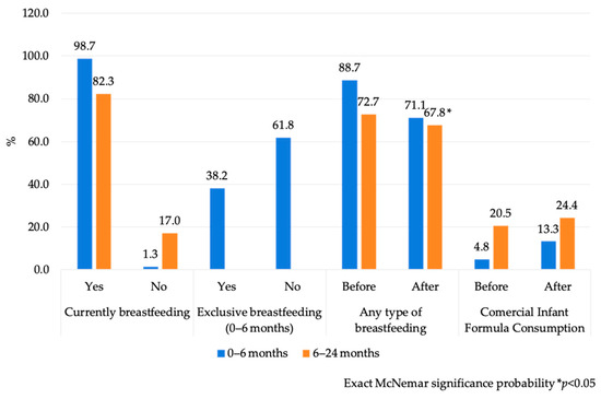 Information on IYCF practices was collected by asking whether she was “currently breastfeeding” (before and after the emergency) and whether she was “exclusively breastfeeding” at the time of data collection (after emergency). Additionally, mothers were asked whether their child was “consuming any other type of liquid or food group” (CIF, plain water, non-human milk, non- and sugar beverages, cereals, legumes, fruits, vegetables, meats, sausages, eggs, dairy, and snacks group (chips, sweets, cookies), both before and after the emergency. To calculate the exclusive breastfeeding indicator [29], we corroborated no consumption of any other type of liquid or food group different from breast milk. To estimate the indicator for any type of breastfeeding, we analyzed how mothers fed their babies before and after the emergency, complemented by the variable measuring the consumption of any other liquids or food groups.
