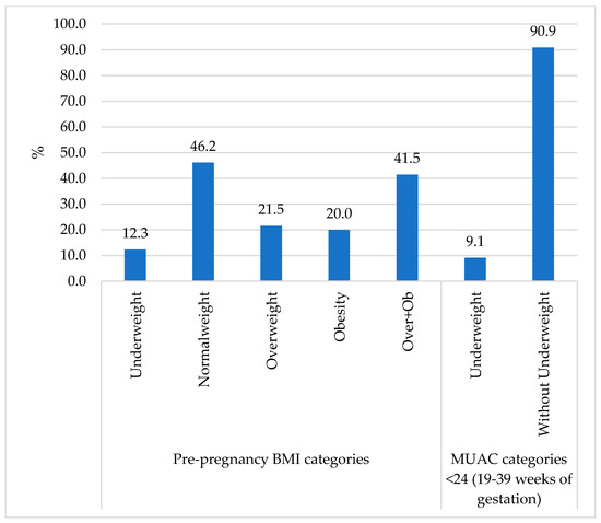 Regarding nutritional status, pregnant women had an average weight of 67.3 kg, height of 1.55 m, a BMI of 28.1 kg/m2 and a MUAC of 29.2 cm. Based on pre-pregnancy BMI, 12.3% (n = 8) were underweight, with 20.6% (n = 7) of these women aged 16 to 24 years. Additionally, 21.5% (n = 14) of pregnant women were overweight, of whom 57% (n = 8) were between 16 and 29 years old. Obesity was observed in 20% (n = 13) of pregnant women, of which 46% (n = 6) were between 25 and 29 years old. Based on the MUAC measurement, only 9.1% (n = 5) of pregnant women were underweight. (Figure 4).