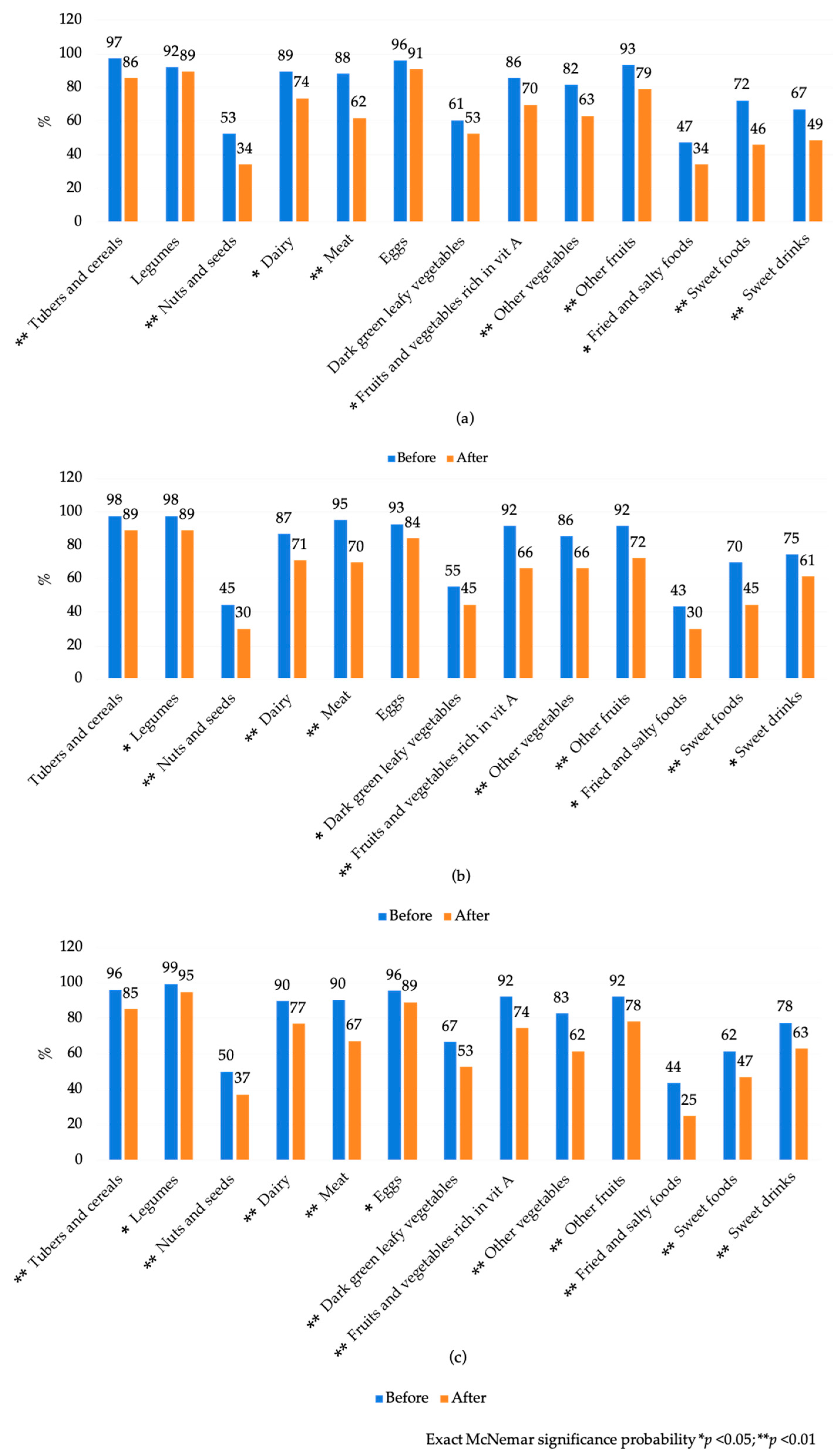 | Tubers and cereals | 74 | 97.4 | 65 | 85.5 | 0.004 | 81 | 97.6 | 74 | 89.2 | 0.065 | 150 | 96.2 | 133 | 85.3 | 0.001 |