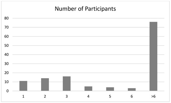 User engagement scores were high, M(SD)UMUX = 5.18 (0.98), with no significant differences, t(156) = 2.93, p = 0.11, between the Functionality M(SD)UMUX_FUNC = 5.41 (0.85) and Active Comparator M(SD)UMUX_AC = 4.96 (1.04) conditions. As an additional quantitative marker of engagement, at a reviewer’s suggestion following preregistration, we examined completion rates. Participants were asked to respond to six text prompts. Each text above a pre-set character limit was sent as additional texts, such that six or more responses means participants completed all text prompts: 61.24% of participants completed all six responses. See Figure 1 for participants’ frequency of responding.