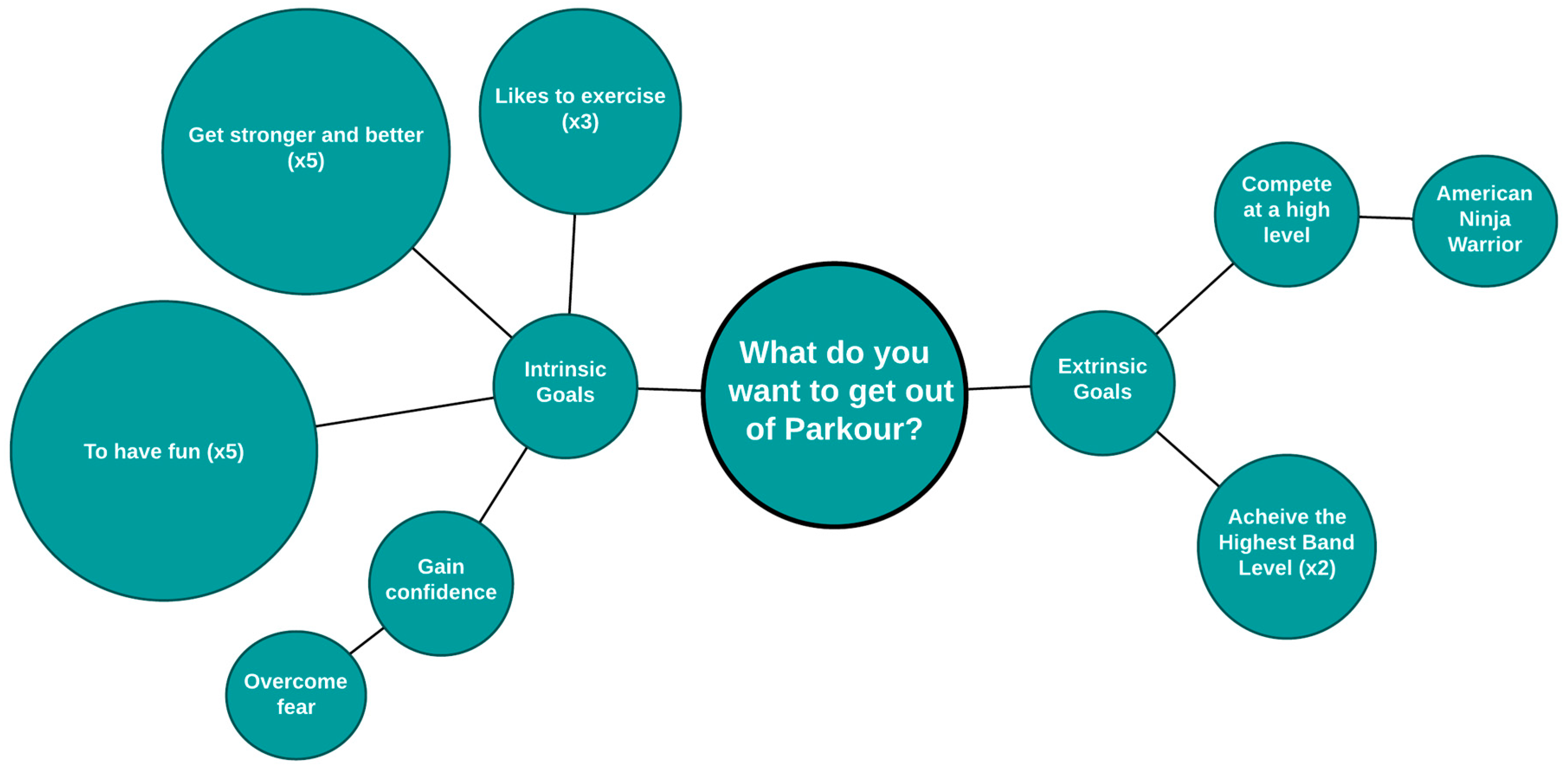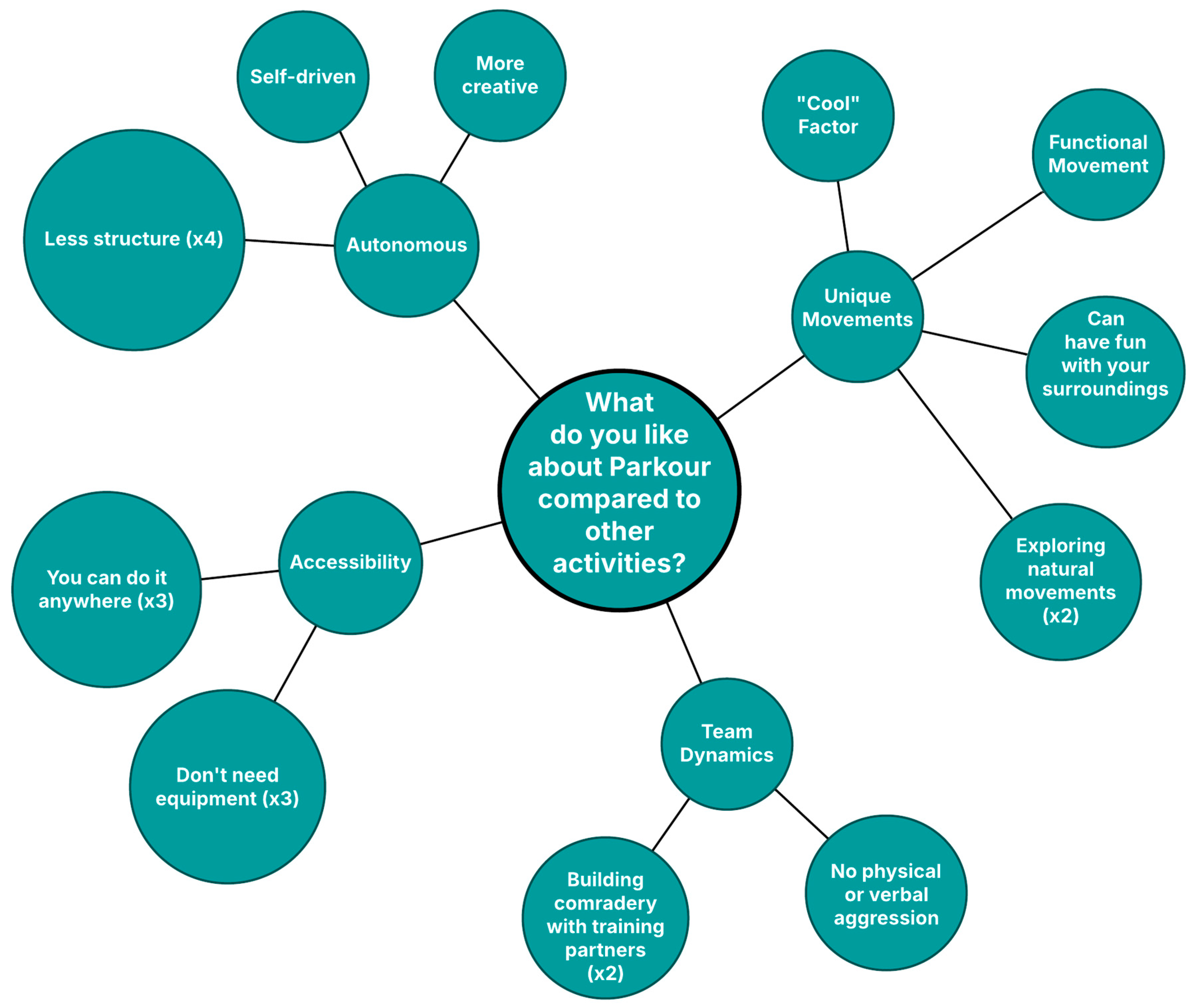 “I really like that it’s determined by you, there is no one telling you, oh, you have to go this way or you have to do this type of vault. You can basically like, choose it all yourself and like, kind of suit your own path. Um, so if you don’t know, you can like push yourself to you can push yourself, um, and that it’s not; it’s about running. It’s about climbing, both natural movement and basically a lot of things into one.”(Male, 13)