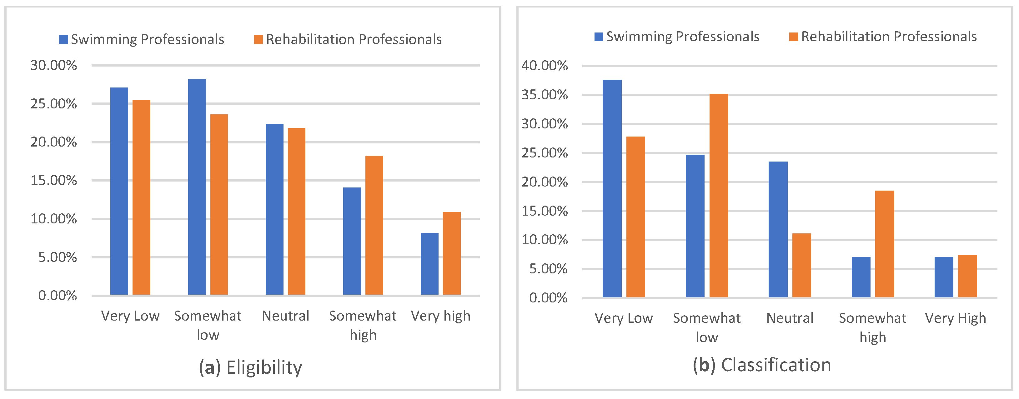 | As a swimming professional, what makes it easier for you to provide swimming activities for children with disabilities? | As a rehabilitation professional, what makes it easier for you to provide swimming activities for children with disabilities? |