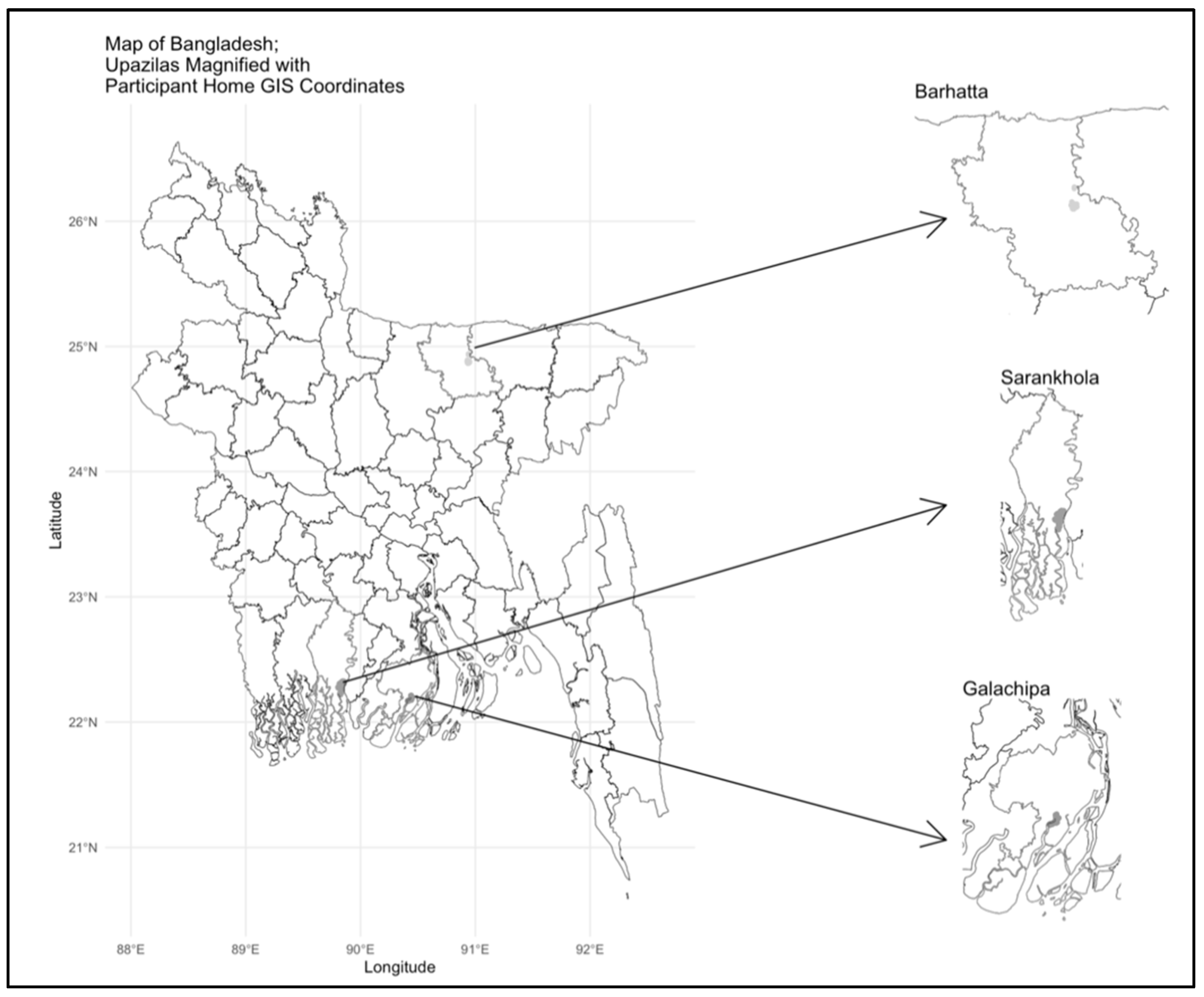 APA StyleJung, Y. S., Afroz, S., Mow, S. S., Wang, X., Sarpy, C., Islam, M. F., Husain, M. N., Hossain, M. S., Sania, A. R., Mostofa, M. G., Quamruzzaman, Q., & Mazumdar, M. (2025). Pediatric Health, Climate Perceptions, and School Absenteeism Across Three Regions of Bangladesh: A Cross-Sectional Study. International Journal of Environmental Research and Public Health, 22(11), 1639. https://doi.org/10.3390/ijerph22111639