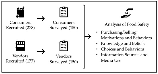 The consumer and vendor surveys included information on demographics; market behaviors; personal perceptions and motivations about food choices and food safety; and sources of food safety information (Figure 1; Supplementary Information S1 and S2). Surveys were administered in face-to-face interviews by trained enumerators in either Amharic, Sidama, Wolayita, or English. Data were collected and validated using SurveyCTO software (Dobility, Inc., https://www.surveycto.com; version 2.70.4), with the data entry interface programmed in Amharic and English.