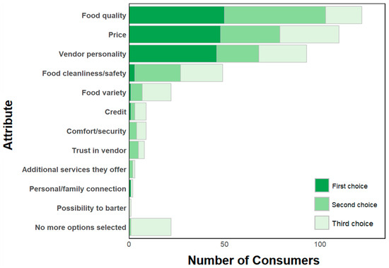 Reasons consumers choose to purchase food from a particular vendor. (This question gave the option for respondents to provide three answers. Answers were recorded in the order of being mentioned. “First choice” means that this attribute was mentioned first.