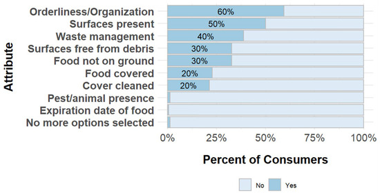 Overall, food quality and price were the most important attributes that consumers look for when deciding which vendor to buy from. Food safety was reported less often (Figure 3). In addition, for most consumers, market cleanliness was not a reason for choosing which market to buy from (76%). Over half (58%) of respondents had neutral opinions about market cleanliness. These consumers perceived the market as “not too clean but not too dirty.” The reasons the remaining respondents gave for the market being very dirty or dirty (24%; N = 123) included waste, improper disposal of leftovers, mud, and vendors not cleaning their area after selling products.