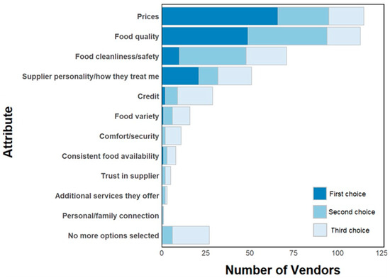 On average, vendors source food from nine suppliers, although this number varied (SD ± 23). Vendors predominantly purchase food from wholesalers (89%), and these vendors often (78% of the time; SD ± 28) repeatedly purchase from the same wholesaler(s). Vendors chose suppliers by their price, food quality, food cleanliness/safety, and how suppliers treat them (Figure 6). If they wanted to change suppliers, most respondents (81%) indicated that they could do so.