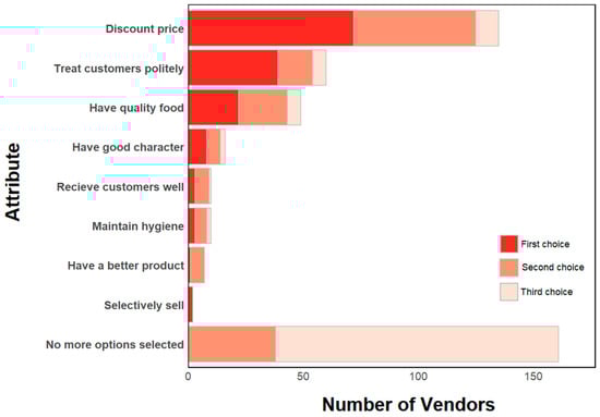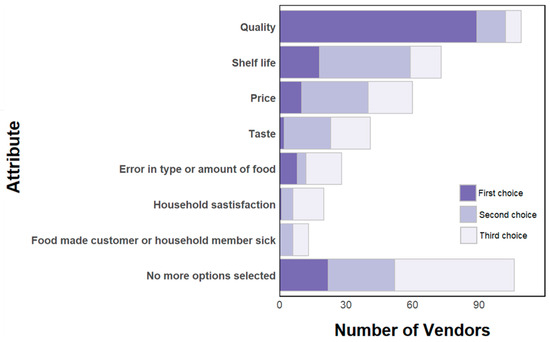 Food safety is usually not a factor of primary salience for consumers when selecting a vendor and buying food. In this study, it was found that price and perceived quality (which may indirectly include safety attributes) are primary purchase factors that both consumers and vendors agree upon. Other studies in markets and with street food vendors across multiple geographies have also shown the dominance of these factors [11,28,29]. Although perceived food safety is not commonly reported as an explicit purchase factor, other characteristics such as shop neatness and vendor trustworthiness may implicitly be associated with food safety practices and could be leveraged in tandem with more explicit food safety cues to inform consumer preferences [12,29,30,31].