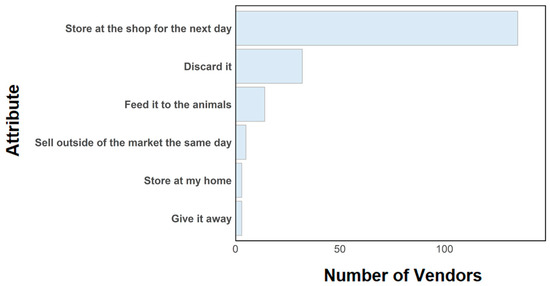 Unsold food was generally kept at the shop for the next day (90%; Figure 9). The majority of the vendors surveyed did not have a refrigerator in their household (83%, N = 125 of 150). Alternative ways vendors store food include covering it or putting it in a crate.