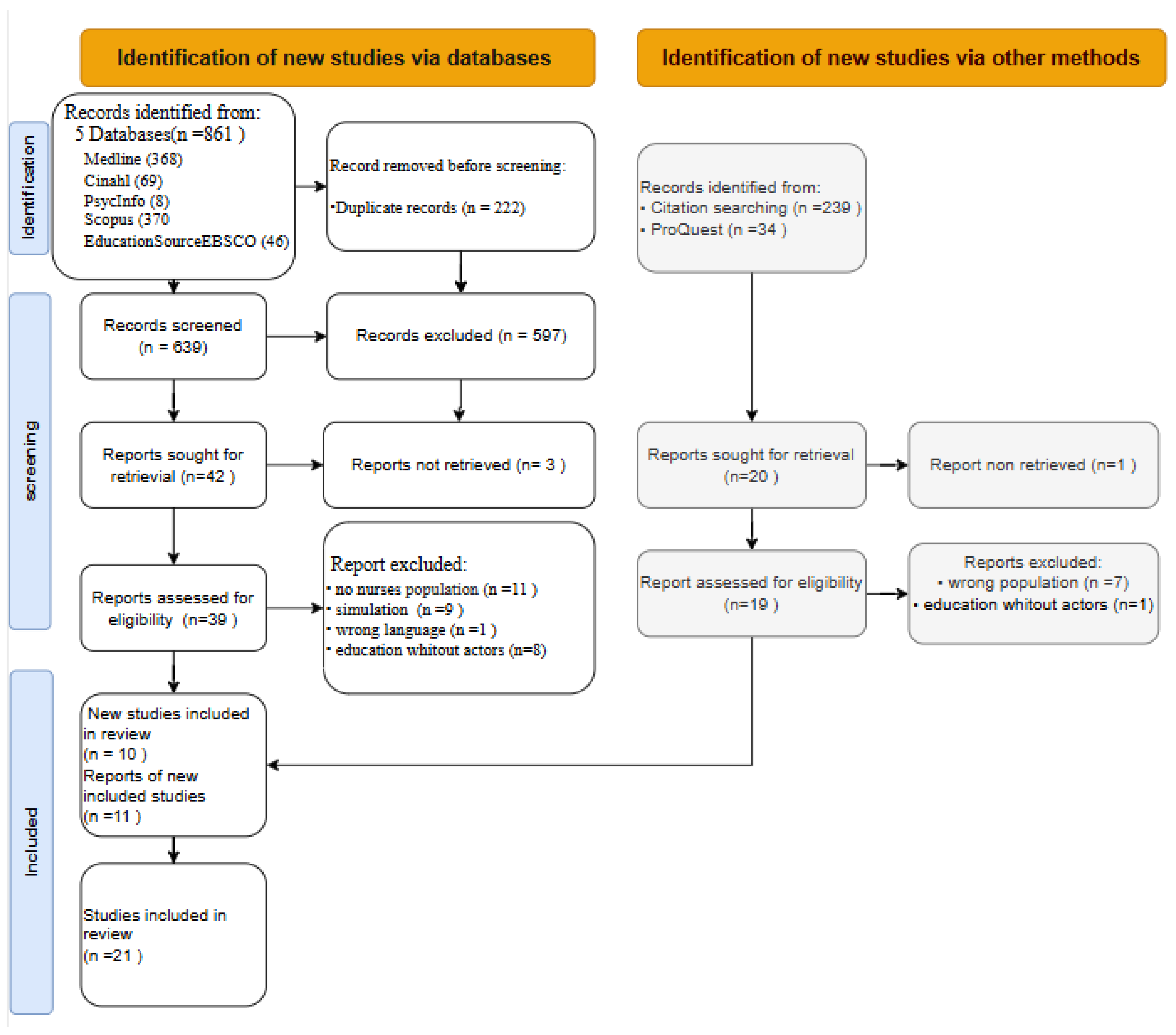| PsycInfo | “nurs* education”.ab,ot. AND (exp Drama/ OR exp Psychodrama/ OR (Theatrical or theatre or drama).ab,ot.) |