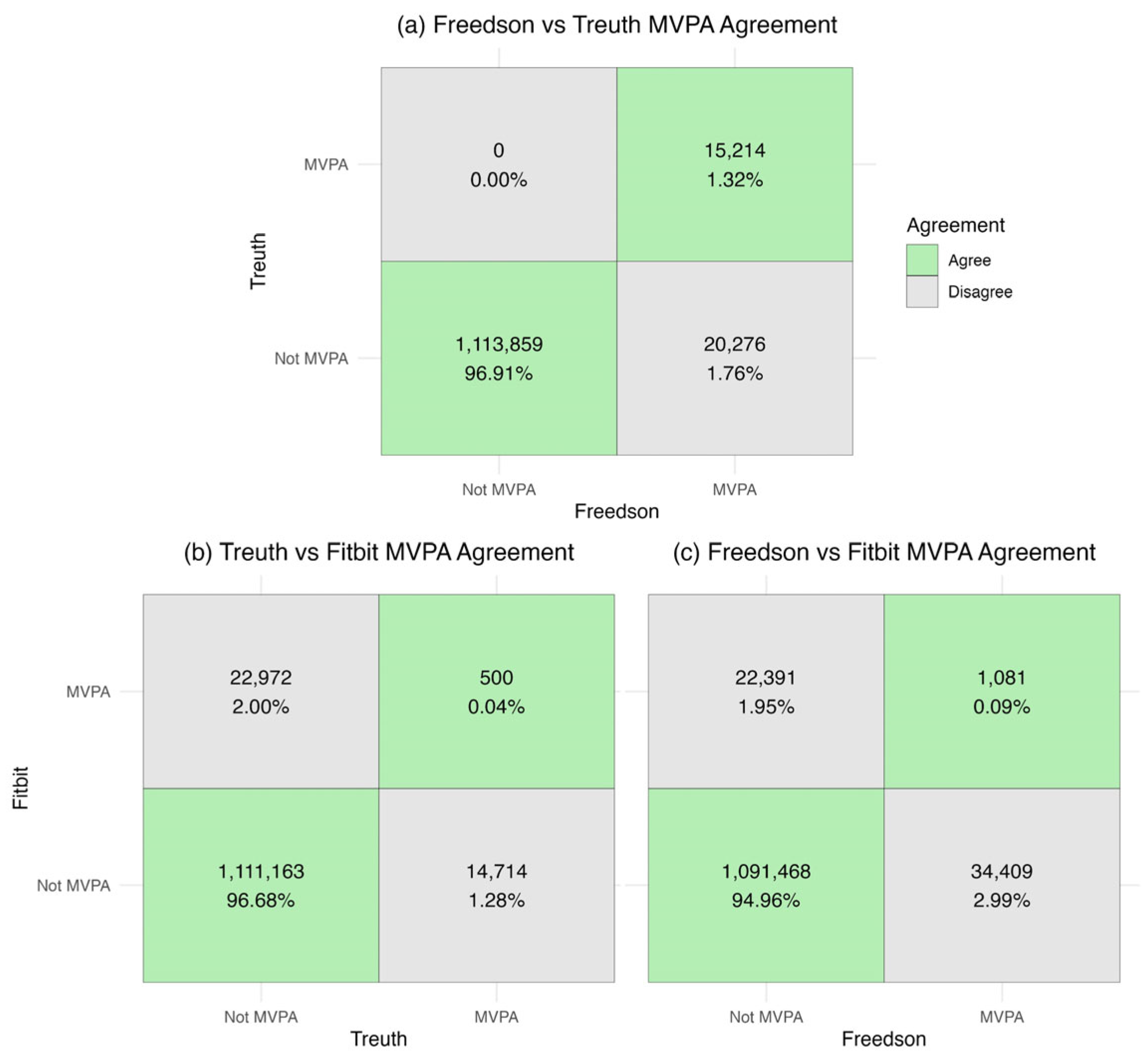 Minute-level binary MVPA agreement (a) Freedson vs. Treuth; (b) Treuth vs. Fitbit; (c) Freedson vs. Fitbit.
