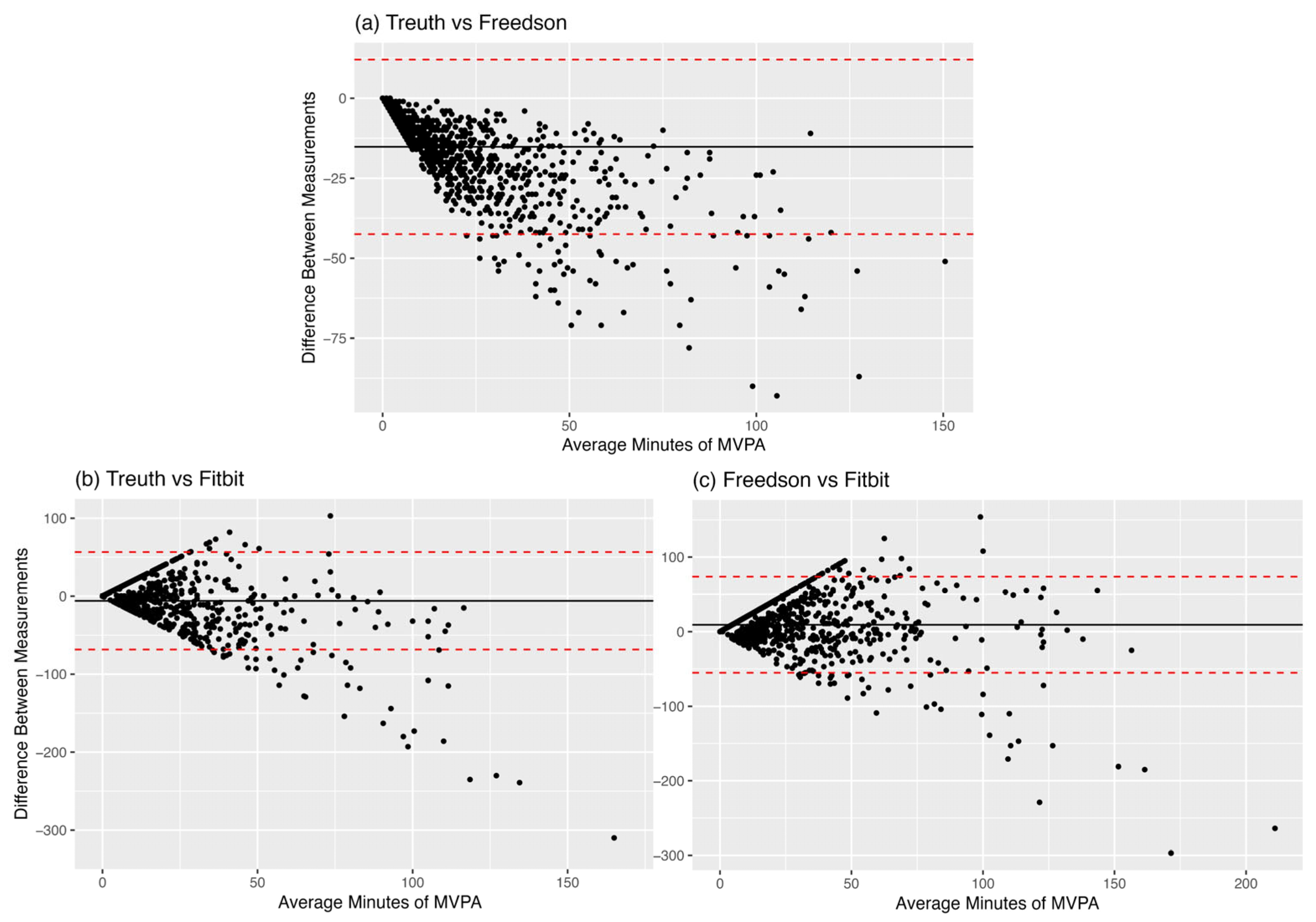 Day-level Bland–Altman Plots (a) Trueth vs. Freedson MVPA; (b) Trueth vs. Fitbit MVPA; (c) Freedson vs. Fitbit MVPA. The black line represents the mean difference (in minutes) between measures, while the red lines represent the limits of agreement.