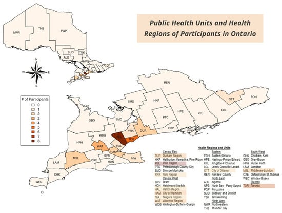 Over 50% of participants (n = 13) resided within the health jurisdiction of the Peel Region and City of Toronto Health Units; these areas were known to be COVID-19 “hotspots”. Overall, study participants resided in 12 different cities/towns across Ontario, representing constituents for 10 different Public Health Units and all of Ontario’s Health Regions except for the northeast and northwest Health Regions (Figure 1).