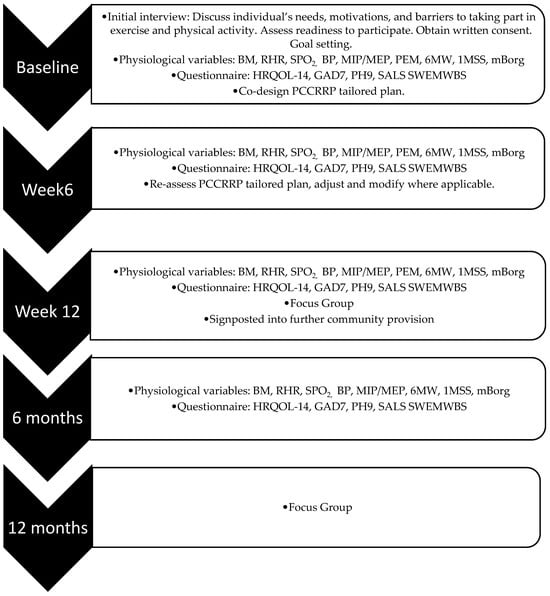 Timeline displaying the outcome measures of PLWPCC in the PCCRRP. Key: Body mass (BM). Resting heart rate (RHR). Arterial oxygen concentration (SPO2). Blood pressure (BP). Lung function: muscle inspiratory pressure (MIP). Muscle expiratory pressure (MEP). Post-exertional malaise (PEM). Six-minute walk (6MW). One-minute sit to stand (1MSS). Dyspnoea (modified Borg scale 1–10). Health-Related Quality of Life (HRQOL-14). General anxiety disorder (GAD7). Physical Health Questionnaire (PHQ9). Short Active Lives (SALS).