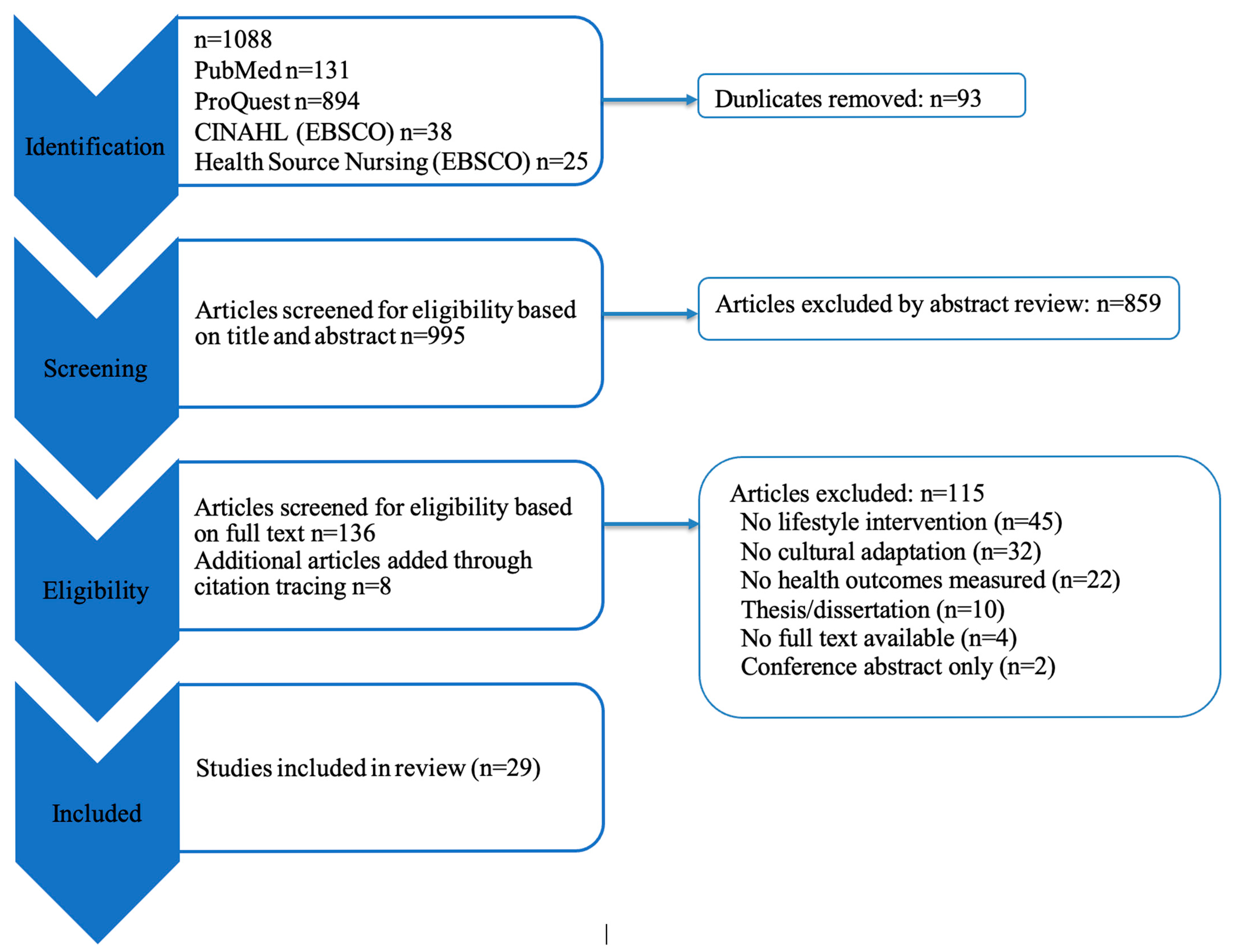 | ProQuest | Search 1: noft(“intervention” AND (“diet” OR “nutrition” OR “physical activity” OR “exercise” OR “lifestyle”)) AND cultur* AND Filipin* Search 2: noft(“intervention” AND (“diet” OR “nutrition” OR “physical activity” OR “exercise” OR “lifestyle”)) AND cultur* AND (CHamor* OR “Guam”) Search 3: noft(“intervention” AND (“diet” OR “nutrition” OR “physical activity” OR “exercise” OR “lifestyle”)) AND cultur* AND “Native Hawaiian” To narrow search: used noft = no full text |