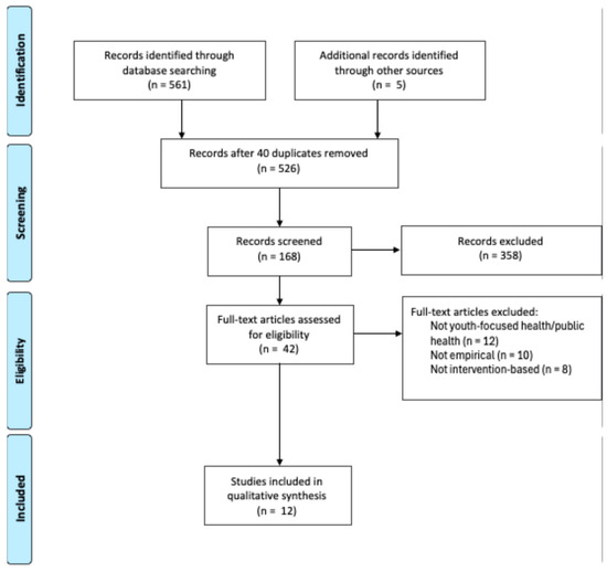 In the first phase, two reviewers independently screened all 526 titles using predefined eligibility criteria. Articles were excluded if they did not address bullying or cyberbullying, did not involve healthcare or public health professionals, or did not focus on youth populations. This phase resulted in 168 articles progressing to abstract review. During the second phase, the abstracts were independently assessed for relevance to the review objectives, and decisions were documented through a collaborative process until consensus was reached. In the final phase, 42 full-text articles were evaluated for inclusion. At the full-text stage, 30 studies were excluded. Twelve did not involve healthcare or public health professionals working with children or youth, 10 were non-empirical, and 8 lacked an intervention focus. Twelve empirical studies were included in the final synthesis. The study selection process is summarized in Figure 1.