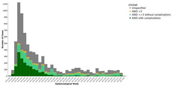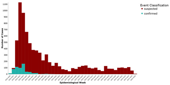 A total of 7515 cases (92.8%) were initially reported in DHIS2 as suspected and 580 (7.2%) as confirmed. We noted a peak in weeks 43–44 of 2022 and then a steady decline of notifications (Figure 1).