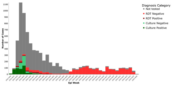 We considered positive culture results as the standard confirmatory diagnosis. The rapid diagnostic test (RDT) was not considered confirmatory. Cases that tested positive by both RDT and culture were classified as culture-confirmed. We classified cases into five lab-based categories: culture positive, culture negative, RDT positive, RDT negative, and not tested. We plotted an epidemic curve based on these categories to illustrate the diagnostic certainty of notified cases.