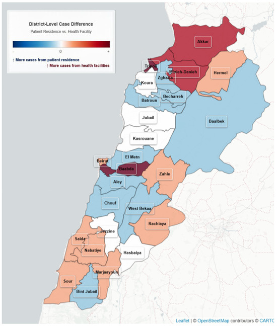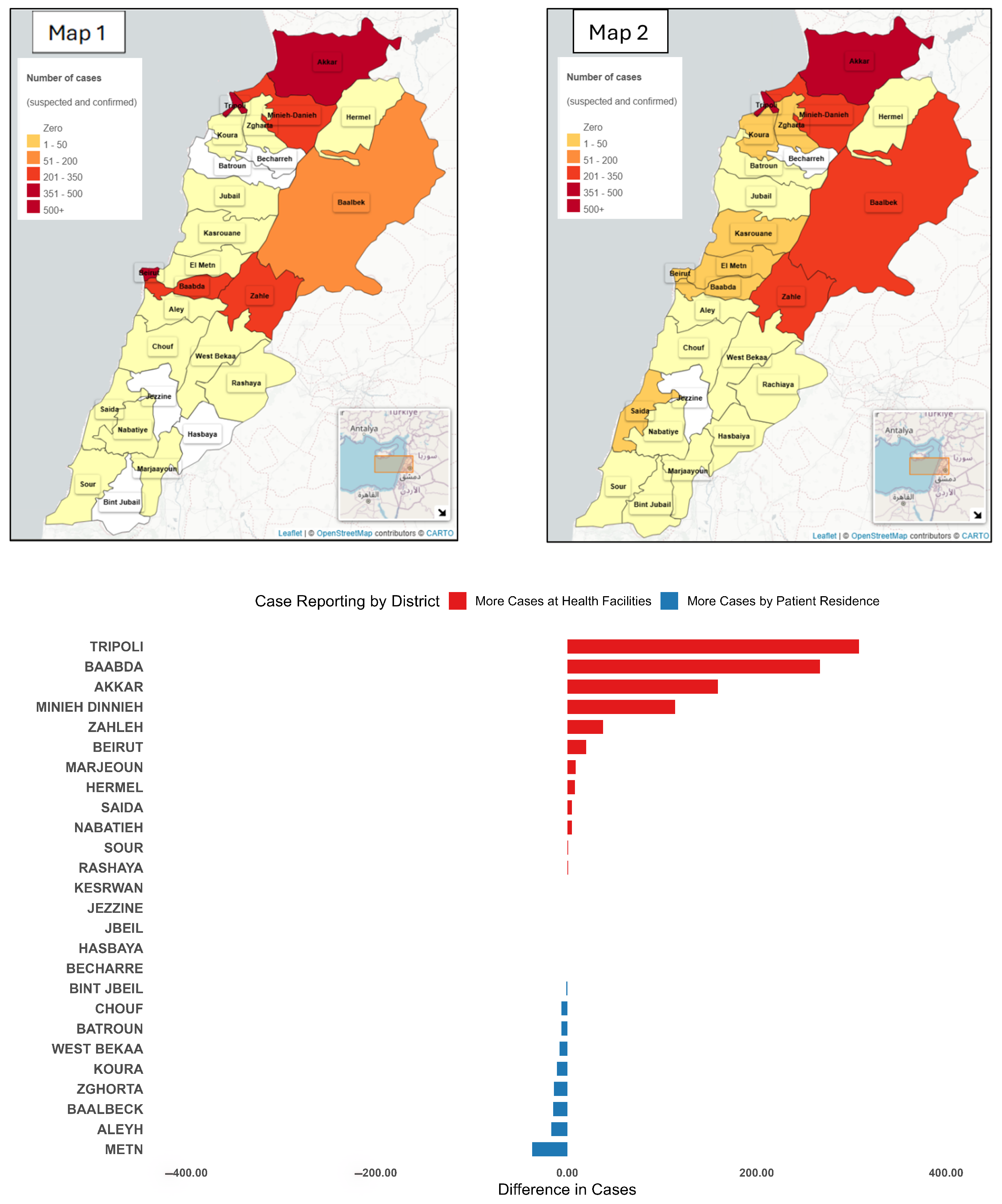 District-Level case differences: Health facility vs. patient residence, Lebanon, 2022–2023. Map 1 presents the incidence of cases notified by the location of reporting. Map 2 presents the incidence of cases by place of residence. The bar chart presents the difference between the number of cases notified by place of reporting and the number of cases notified by place of reporting.
