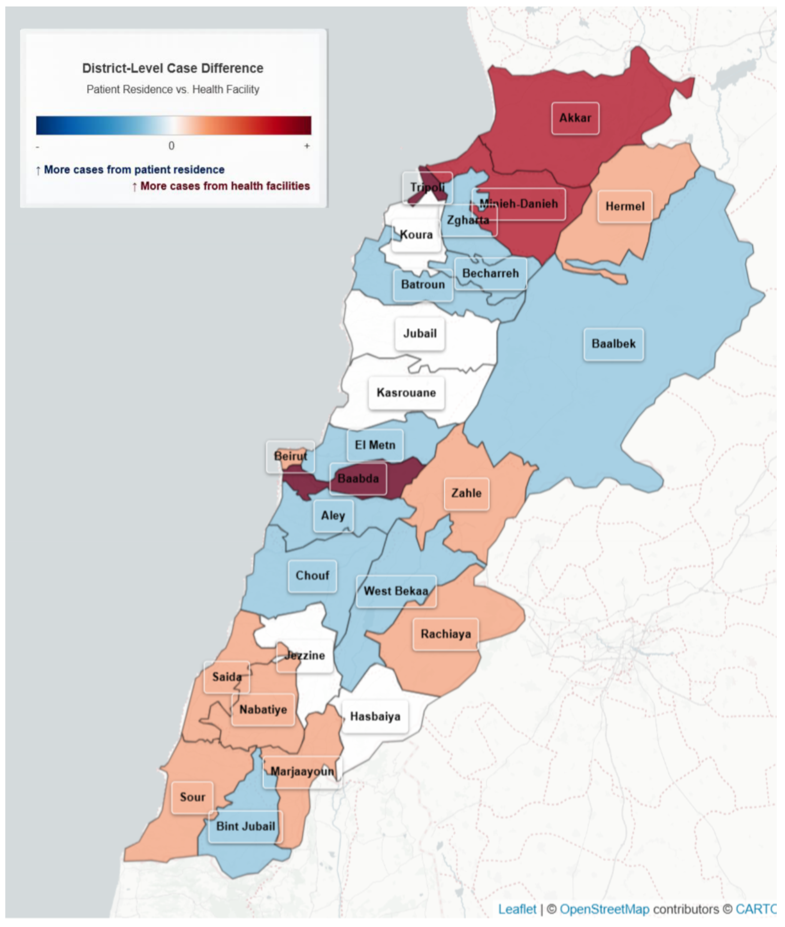 The third observation addresses geographic data. The comparison of notified cases by reporting facilities with their residence provided important insights. High concordance was observed between place of reporting facility and residence at the governorate level, but notable differences remained at the district level, particularly in remote regions and Beirut suburbs. These differences likely reflect referral patterns and health-seeking behaviors and must be considered when interpreting disease spread or targeting interventions. During the outbreak, the mapping on place of residence was generated manually and shared on daily basis with the decision makers to guide the response activities.