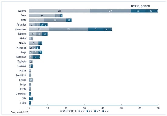 A total of 115 participants were included in this study. Descriptive statistics were used to summarize the demographic characteristics of participants, including the mean and standard deviation (SD) of age and the sex distribution (percentages). The total number of evacuation days and the number of evacuations were calculated and described using the median and interquartile range (IQR). The distribution of evacuation duration for the first five evacuations was also examined across different shelters. Participants were then categorized into two groups: those who remained in their homes after the disaster (stay-at-home group; n = 27) and those who evacuated (evacuation group; n = 88). For these two groups, the mean age with SD, sex distribution (percentages), and main diseases (percentages) were calculated and compared. For the evacuation group, the shelter was described using the median and IQR for the following variables: total days of evacuation, duration of stay at each shelter (shelters 1–5), and the total number of evacuations.