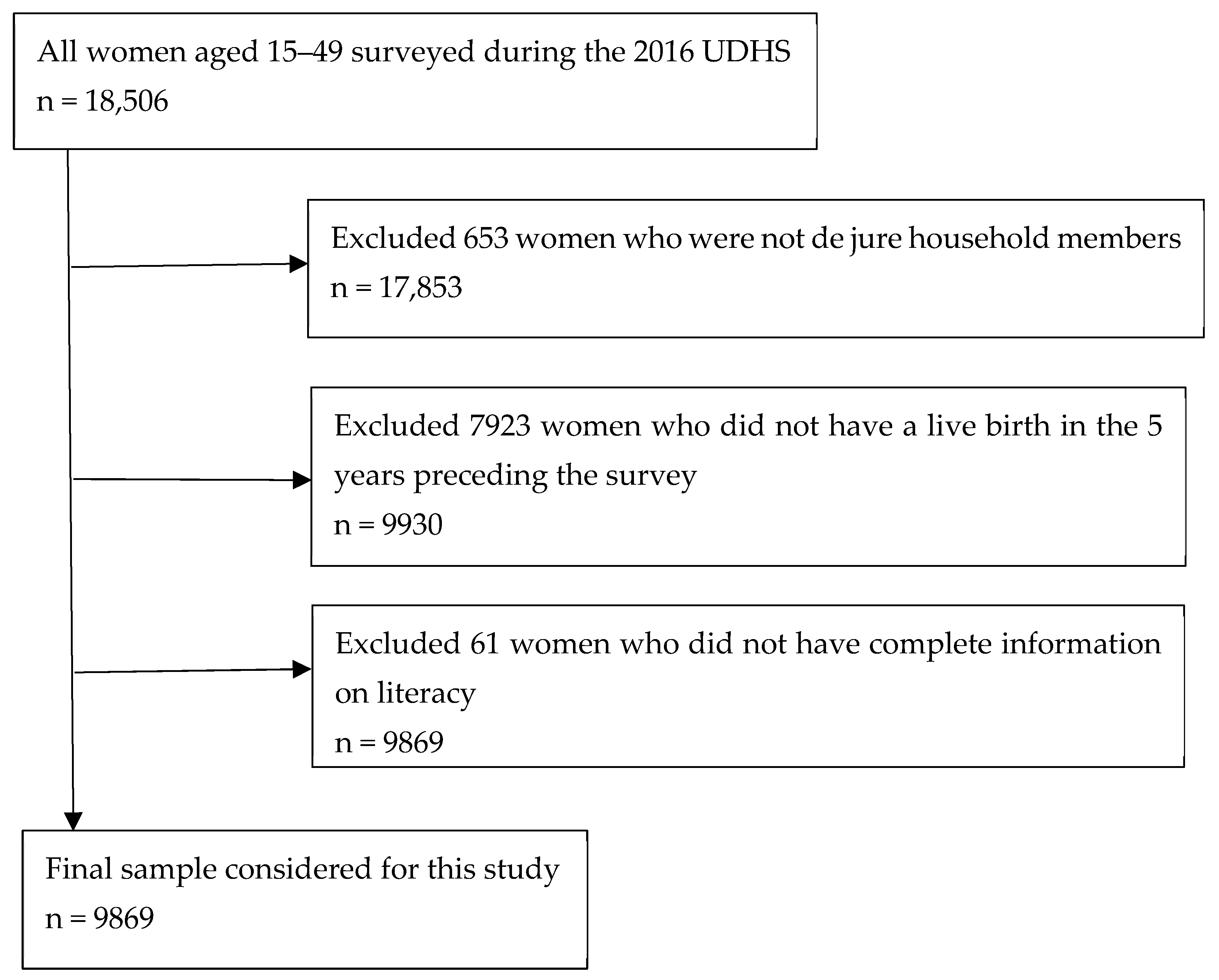 - UBOS; ICF International. Uganda Demographic and Health Survey 2016; The DHS Program ICF: Rockville, MD, USA; UBOS: Kampala, Uganda, 2018. [Google Scholar]