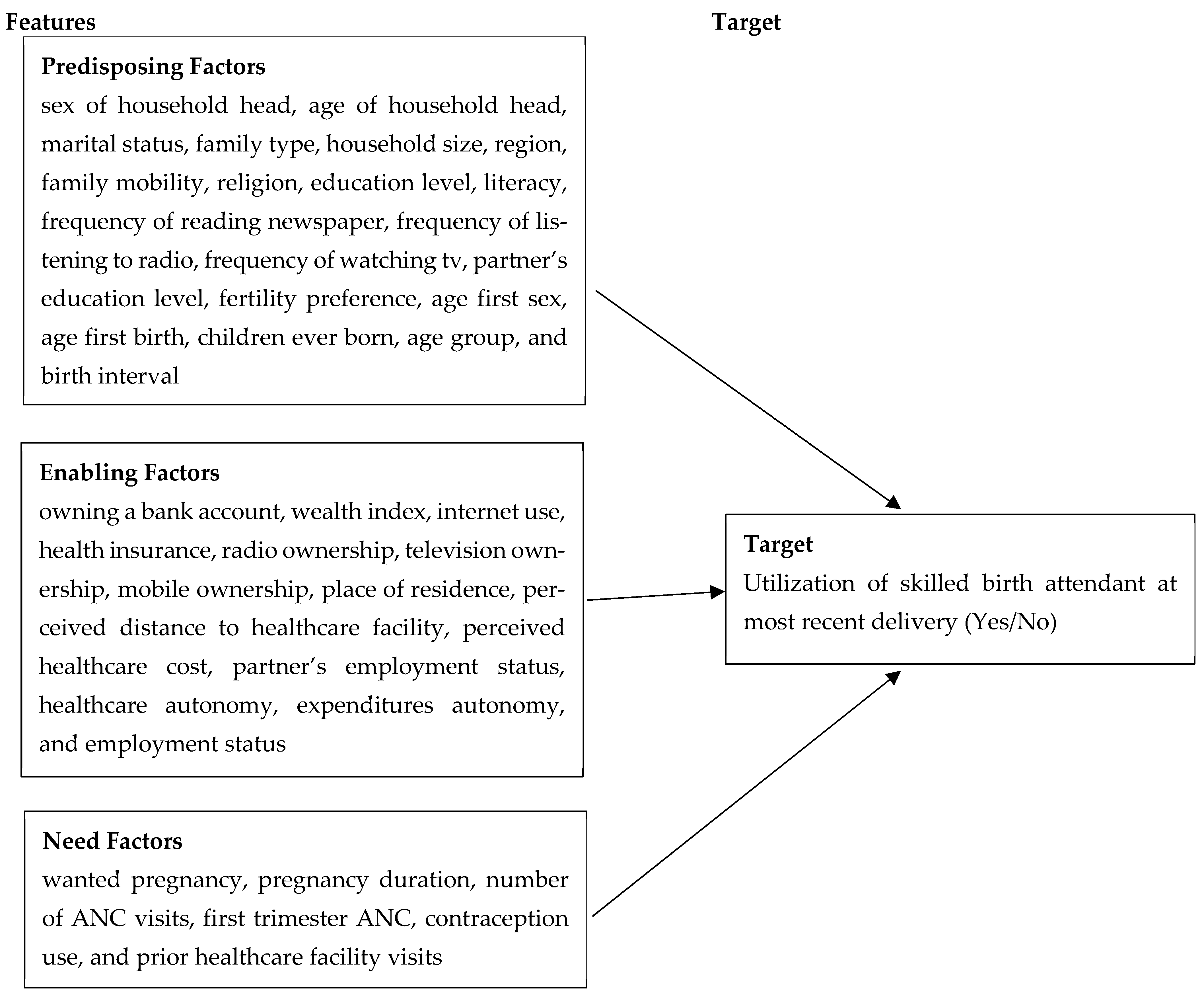 - Need factors: These are the individual’s perception of their health status and their perceived need for healthcare. Variables included: wanted pregnancy, pregnancy duration, number of ANC visits, first trimester ANC, contraception use, and prior healthcare facility visits.