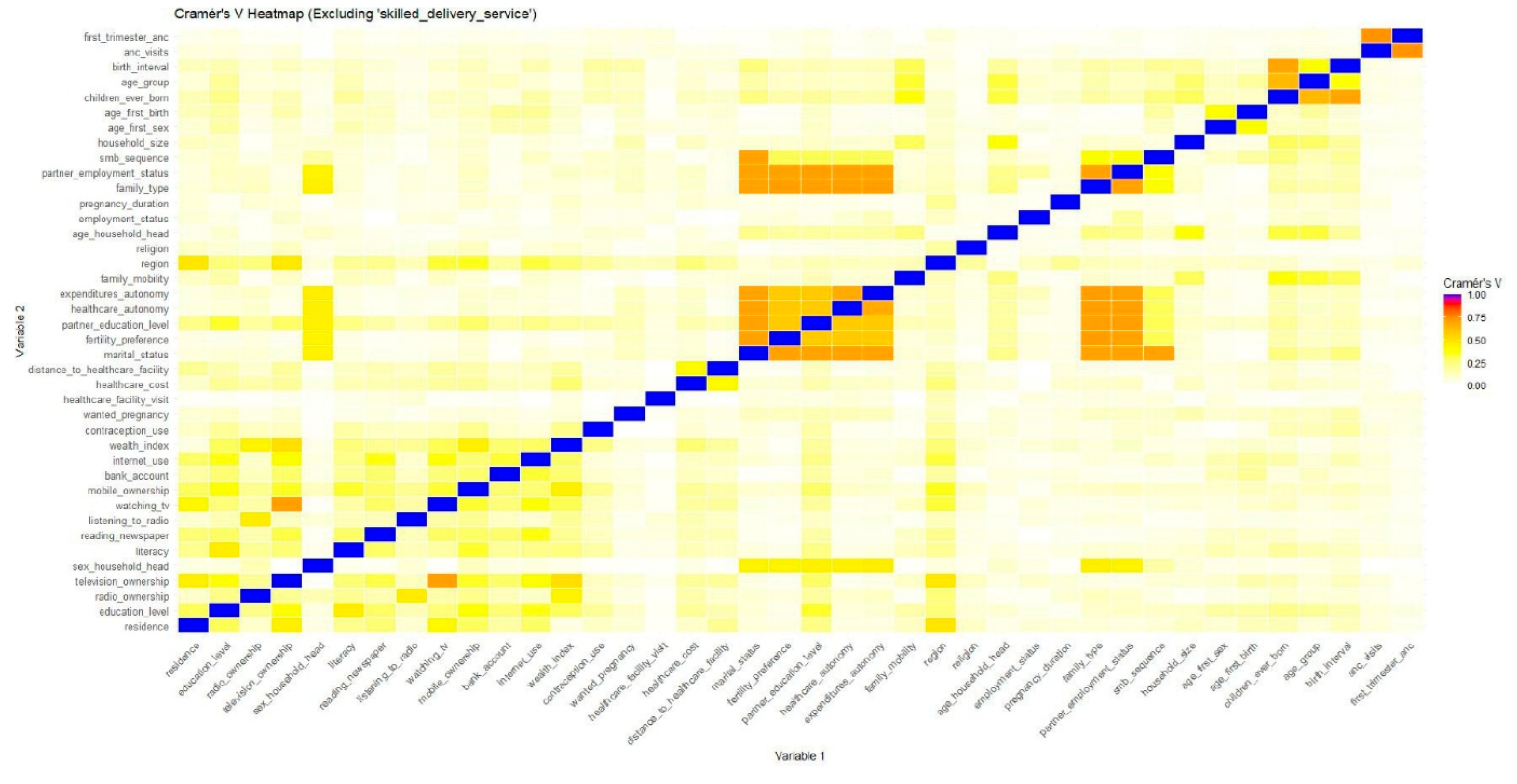 - Enabling factors: These are the economic or logistic resources or conditions that facilitate or hinder access to healthcare. Variables included: owning a bank account, wealth index, internet use, health insurance, radio ownership, television ownership, mobile ownership, place of residence, perceived distance to healthcare facility, perceived healthcare cost, partner’s employment status, healthcare autonomy, expenditures autonomy, and employment status.