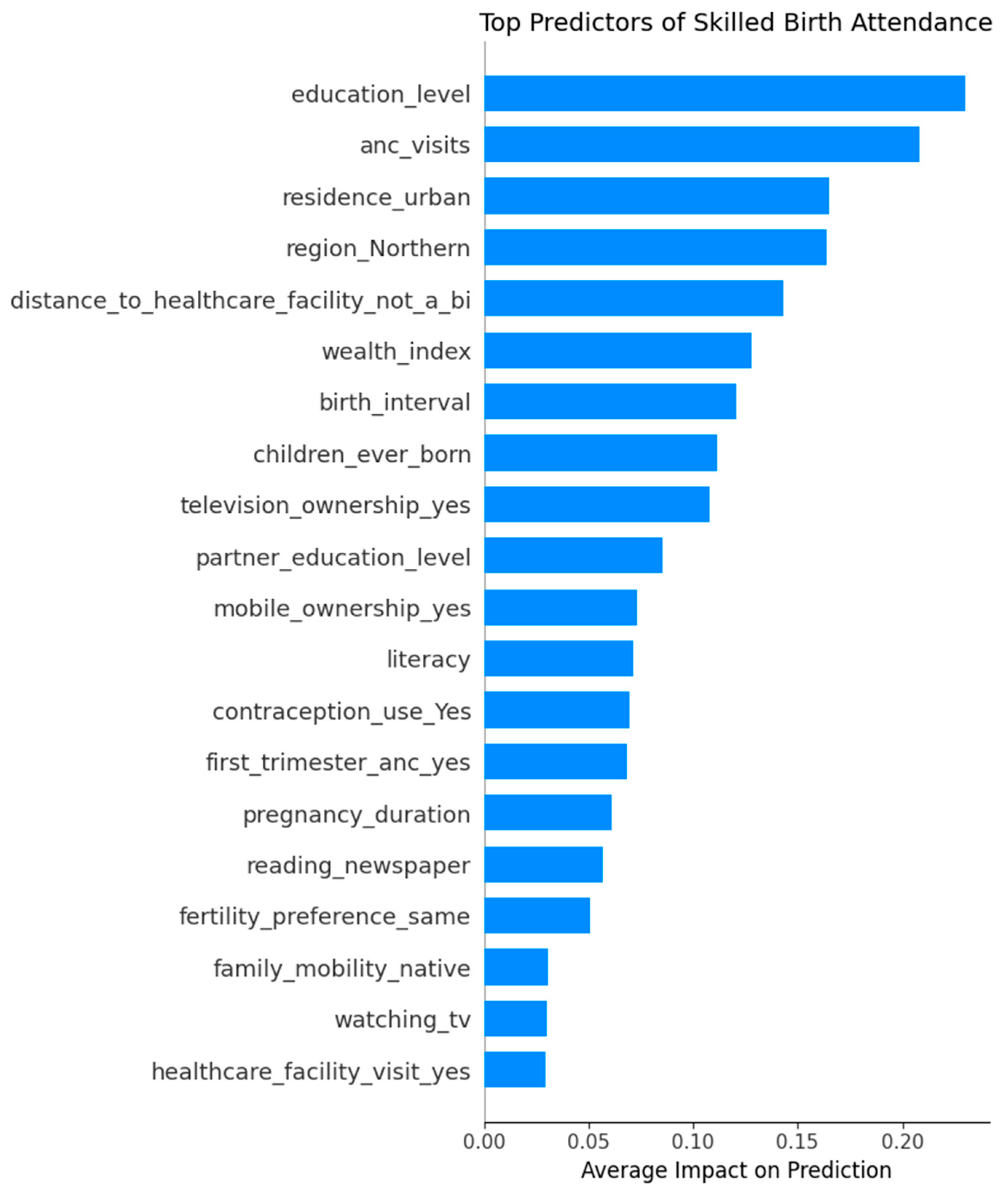 Chicago/Turabian StyleMemon, Shaheen M. Z., Robert Wamala, and Ignace H. Kabano. 2025. "Identifying Predictors of Utilization of Skilled Birth Attendance in Uganda Through Interpretable Machine Learning" International Journal of Environmental Research and Public Health 22, no. 11: 1691. https://doi.org/10.3390/ijerph22111691