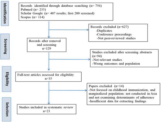 The PRISMA diagram (Figure 1) reveals the selection process and shows the reasons for exclusion. The initial search across PubMed, Scopus, and Google Scholar yielded 756 records. After removing duplicates, conference proceedings, and non-peer-reviewed sources (n) = 627), 129 records remained for title and abstract screening. Of these, 94 records were excluded for reasons including the following: wrong population (not parents/caregivers of under-five children, or not marginalized groups), wrong setting (studies conducted outside Asia or in high-income countries), wrong outcome/focus (articles on vaccine efficacy, safety, or clinical outcomes rather than determinants of parental adherence), and publication type/insufficient data (commentaries, editorials, protocols, or abstracts lacking relevant information).Thirty-five full-text articles were assessed for eligibility. Fourteen were excluded for the same reasons—wrong population (n = 5), wrong outcome (n = 4), wrong setting (n = 2), adult immunization focus (n = 2), and insufficient data (n = 1). Finally, 21 studies met all inclusion criteria and were included in the narrative synthesis. Two included studies were themselves systematic reviews.These were not integrated into the thematic synthesis alongside primary studies.Instead, they were retained for context and triangulation.Findings from these reviews were cited descriptively where relevant but were not used to identify or code determinants.No data were duplicated from primary studies already included.