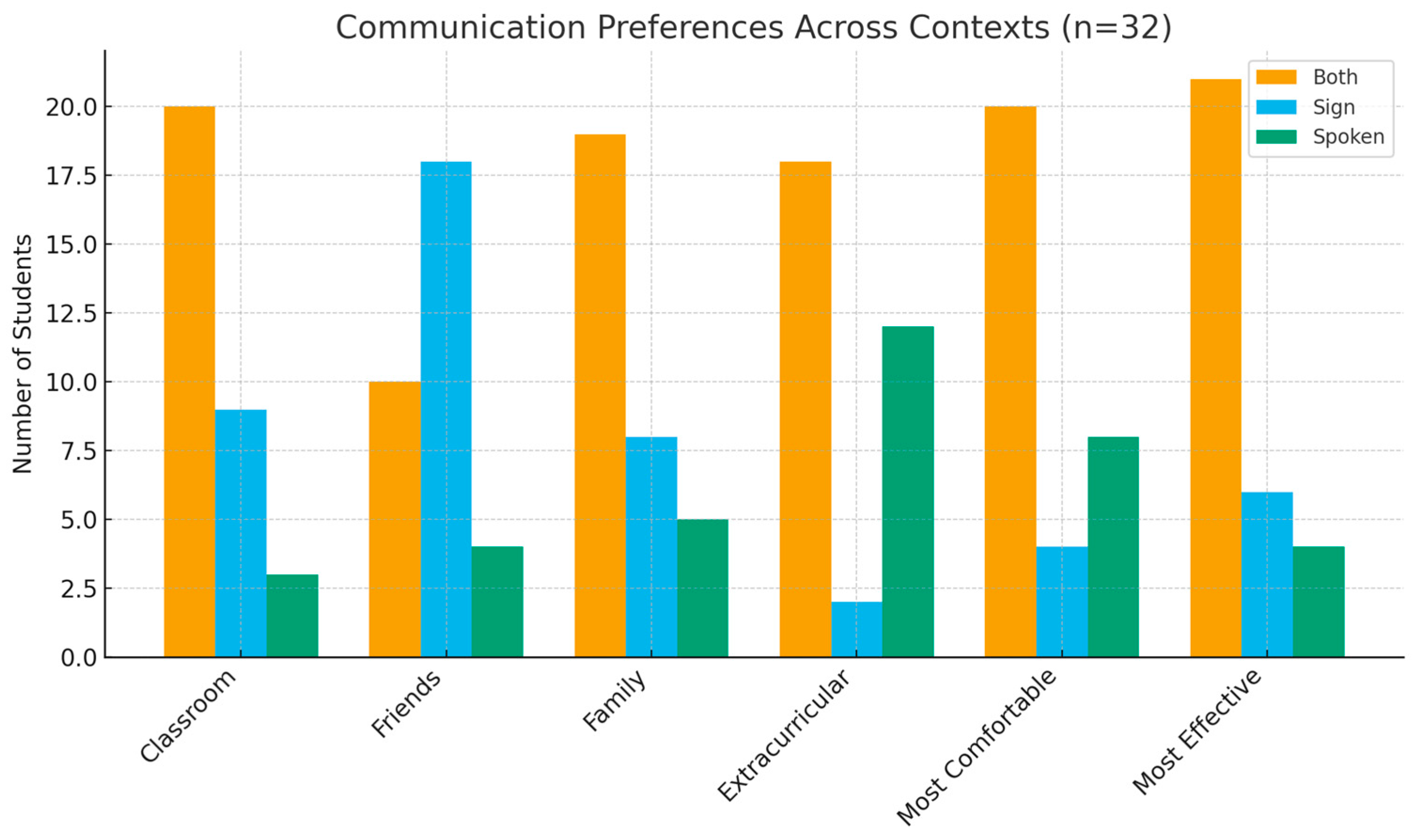 - Communication Preferences: reported use of spoken language, sign language, or bimodal strategies across academic and social contexts.