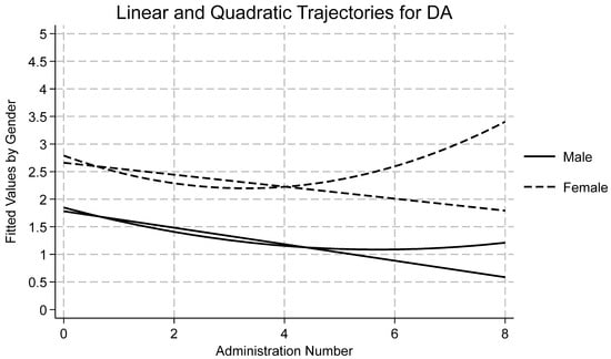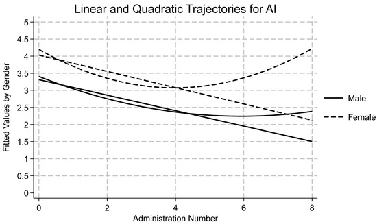 Table 1 displays descriptive statistics by time and subscale for all measures as well as reliability statistics for each subscale at the first wave. Skewness and kurtosis were assessed for each variable by timepoint, and all were found to be within accepted limits [72,73]. Using an a priori cut off of ±3.5 standard deviations from the mean, no outliers were detected. Data were missing at random and therefore full information maximum likelihood was used to estimate each model due to its ability to handle missingness. A summary of the findings of each model follows, with emphasis on Model 4 and quadratic time. Results for Model 4 by variable are presented in Table 2. Effects for models one, two, three, and four may be found in the Supplemental Materials (Tables S1–S5). Linear and quadratic trajectories for AI, DA, SC, and SI may be found in Figure 1, Figure 2, Figure 3 and Figure 4, respectively. Linear and quadratic trajectories for ADU may be found in the Supplemental Materials.