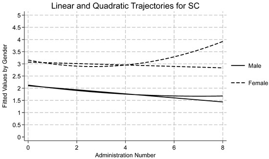 Fit indices showed that Model 4 had the strongest fit (see Table 2). ICC indicated that 44% of the variation in SC was attributable to differences between participants. TE was found to be a significant predictor across all four models. The average longitudinal effect of TE on SC was 0.18, meaning that a one-point increase in TE resulted in a 0.18-point increase in SC, holding all other fixed effects constant. Moreover, linear and quadratic time were significant predictors of change in SC (see Figure 3). Linear time showed an average 0.14 decrease in SC over time, while quadratic time showed a significant, positive coefficient, meaning that initially SC scores decreased, but as time progressed, SC increased. Among covariates, gender and race/ethnicity were statistically significant. Across timepoints, girls scored nearly one point higher than boys. Black, Hispanic, and Other youth scored 0.6 points lower on the SC scale compared with White youth. The random effect for SC was 1.22, which represented a modest amount of variation across individuals. The random effects of time and TE were minor but indicated some variation between individuals.