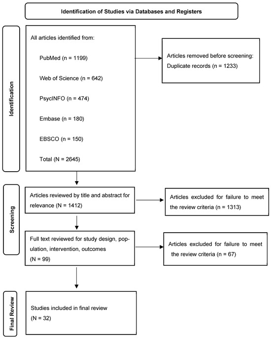 The initial search process yielded 2645 articles, with 1199 of the results from PubMed, 642 from Web of Science, 474 from PsycINFO, 180 from Embase, and 150 from EBSCO. Covidence identified and removed 1232 duplicated studies, and 1 article was manually identified as a duplicate. Full search and results are shown in Figure 1. Thus, 1412 articles were screened using titles and abstracts, and 1313 articles were excluded, leaving 99 articles for full-text review. From this total, 67 studies were excluded because they were not empirical studies (e.g., review, dissertation, abstract) (n = 19); did not have outcomes of ANX or DEP or SUD (n = 14); did not separately report ANX or DEP or SUD (n = 10); did not separately report results for the Latino American population (n = 7); did not include risk or protective factors (e.g., studies that report prevalence or group difference) (n = 12); and either ANX or DEP or SUD was the independent variable rather than the outcome (n = 5). Thirty-two studies were included in the final sample for review.