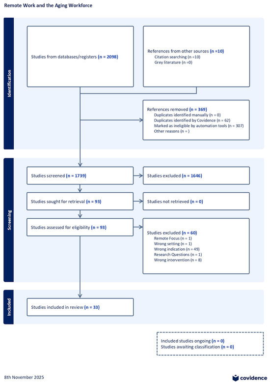 Adegoke, K.; Kayode, T.; Singh, M.; Gusmano, M.; Knapp, K.A.; Steger, A.M. Remote Work, Well-Being, and Healthy Labor Force Participation Among Older Adults: A Scoping Review. Int. J. Environ. Res. Public Health 2025, 22, 1719. https://doi.org/10.3390/ijerph22111719