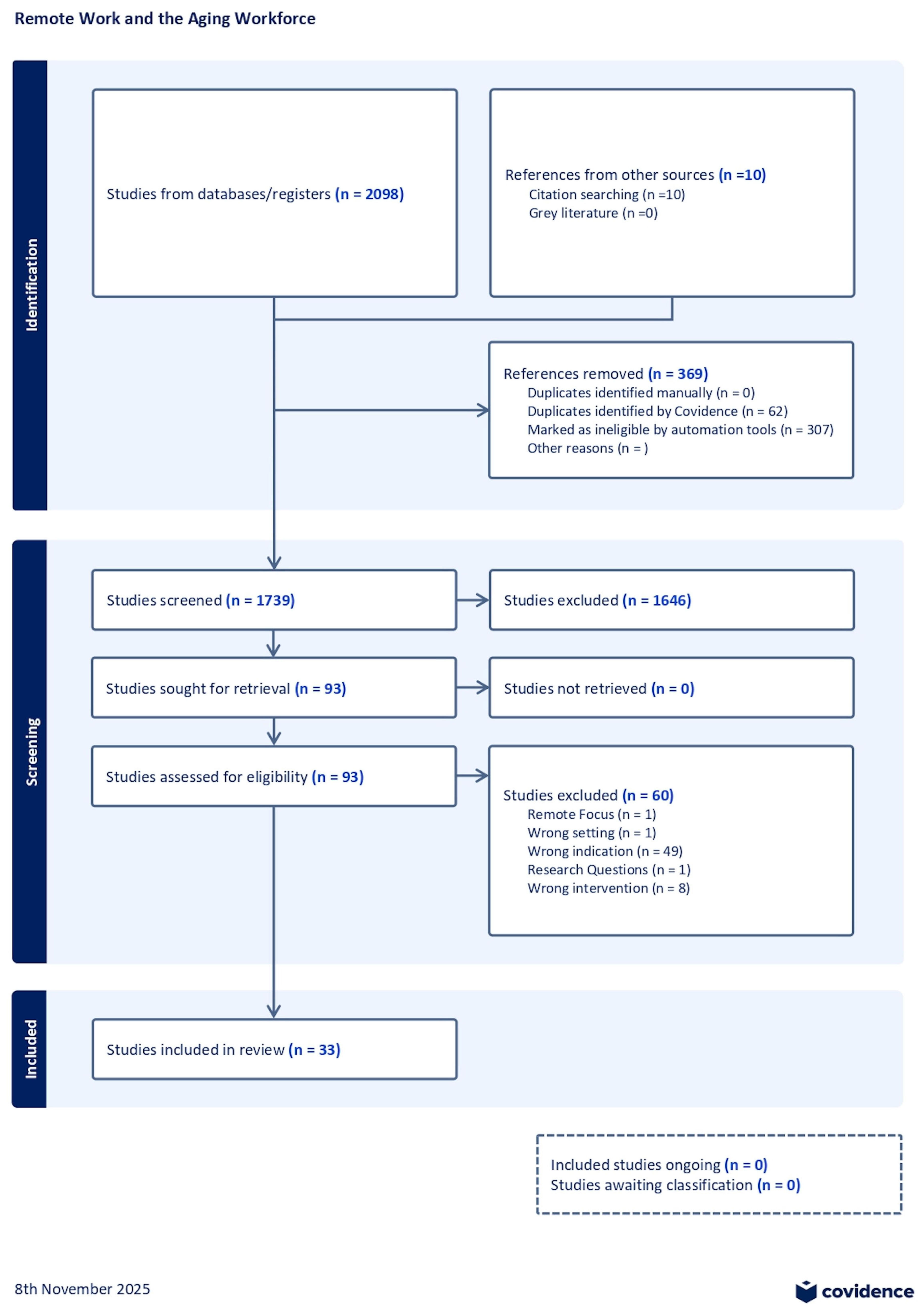 | 3 | Arvola R et al. Sci Ann Econ Bus 2017 [16] | 2017 | Estonia | High | Survey | Aged 50+ teleworkers | ICT skill gaps | Flexible hours | Higher satisfaction; reduced commuting fatigue | Invest in digital training |