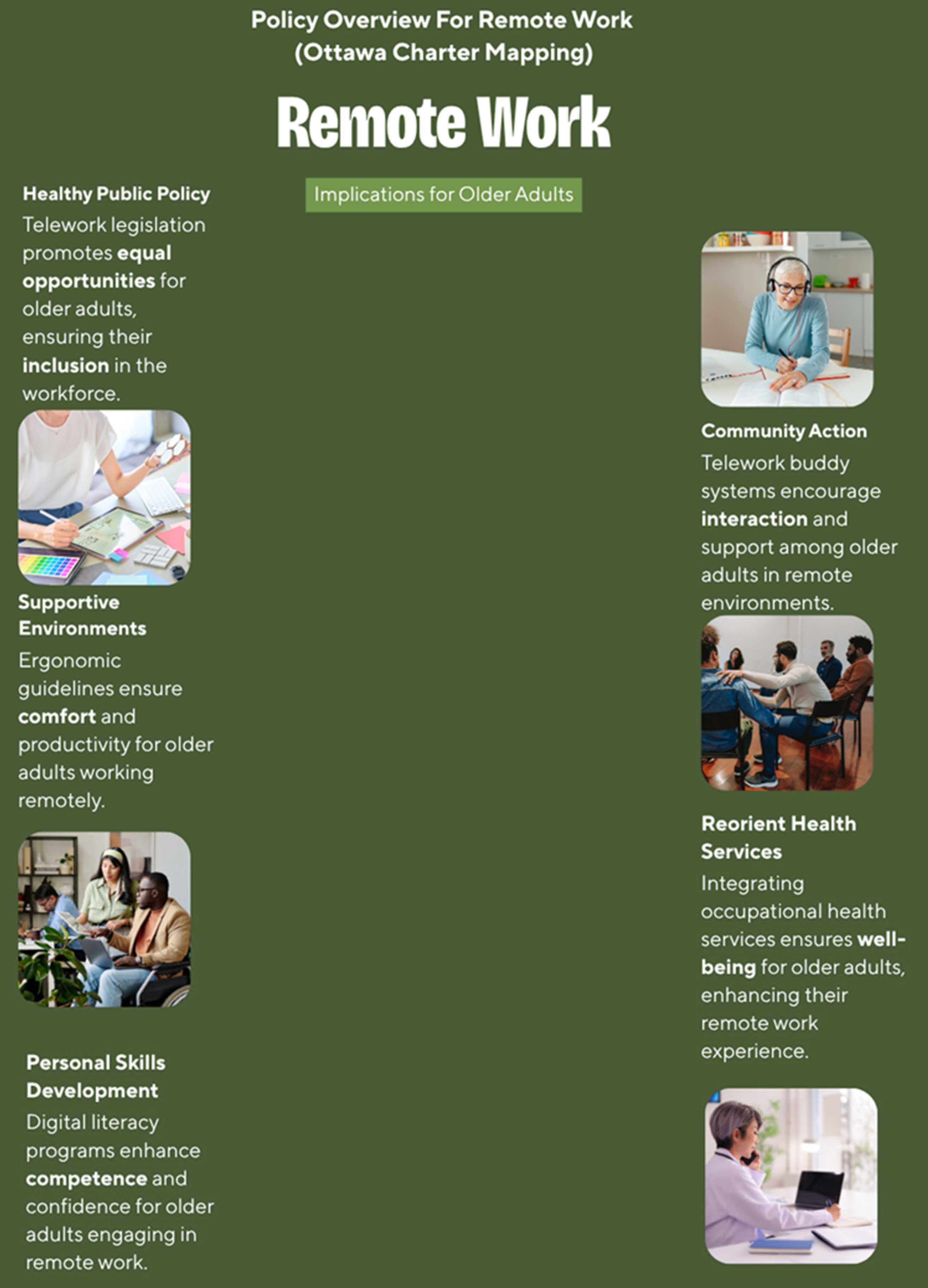- Consider the health promotion opportunities of working remotely in later life, particularly concerning autonomy, ergonomically safe work environments, and social inclusion.