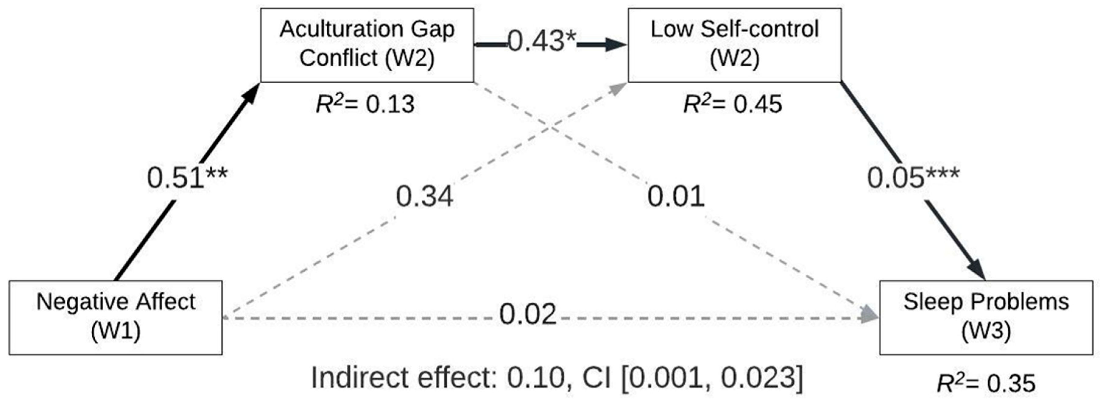 | Acculturation Gap Conflict W2 (M1) | Low Self-Control W2 (M2) | Sleep Problems W3 (Y) | ||||||||||