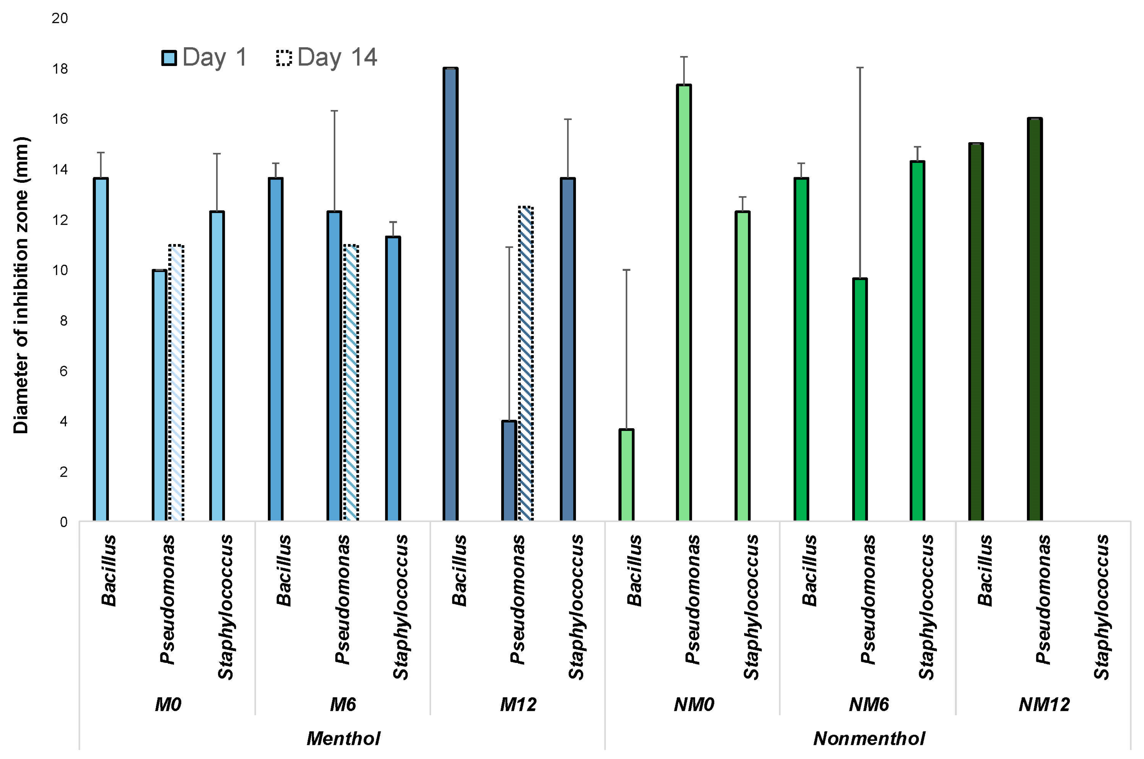 | Non-menthol (6 mg/mL) | Pseudomonas aeruginosa | S | S | S | R | S |