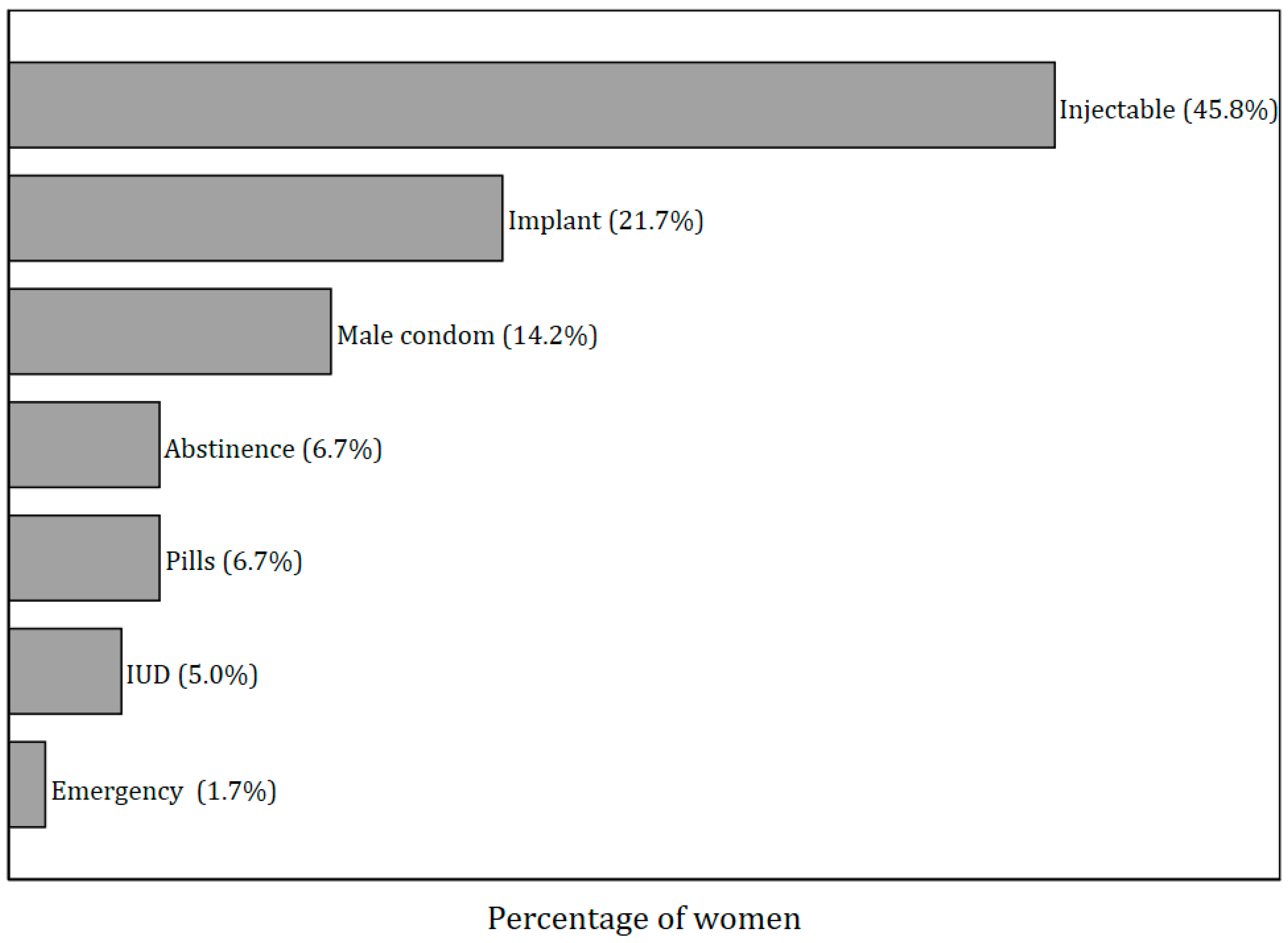 - Wambi, R.; Mujuzi, H.; Siya, A.; Maryhilda, C.C.; Ibanda, I.; Doreen, N.; Stanely, W. Factors influencing contraceptive utilisation among postpartum adolescent mothers: A cross sectional study at China-Uganda friendship hospital. Contracept. Reprod. Med. 2024, 9, 37. [Google Scholar] [CrossRef] [PubMed]