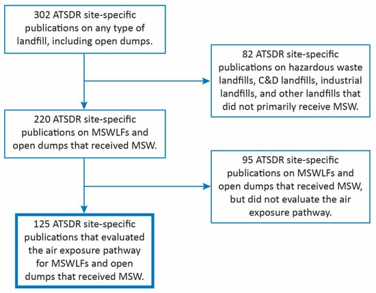 Third, the ATSDR reviewed the 220 documents to determine which subset considered the air exposure pathway. This step was needed because PHAs and HCs may address different exposure pathways (e.g., inhalation, ingestion, and dermal contact). This assessment focuses on the ATSDR’s evaluations of air emissions from MSWLFs and open dumps. Among the 220 documents that were reviewed at this step, 125 included an ATSDR conclusion pertaining to the air exposure pathway. These 125 documents are examined in this review.