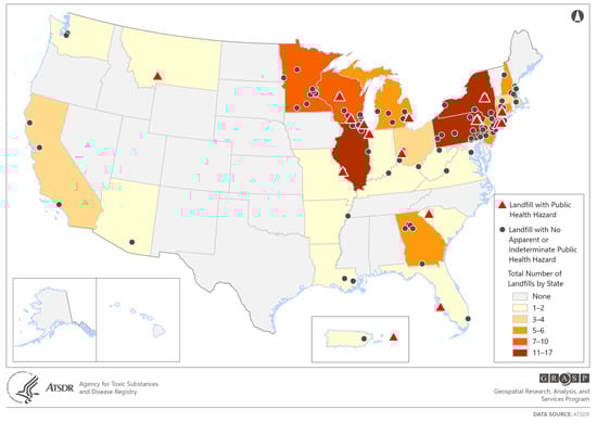 The Agency for Toxic Substances and Disease Registry (ATSDR) protects communities from the harmful effects of hazardous substances in the environment. The ATSDR does this by investigating environmental health threats in communities and taking action to reduce harmful exposures and their health consequences. For more than 40 years, the ATSDR has applied this mission to a broad array of anthropogenic and natural sources of environmental contamination [,]. The sources include municipal solid waste landfills (MSWLFs) and open dumps.