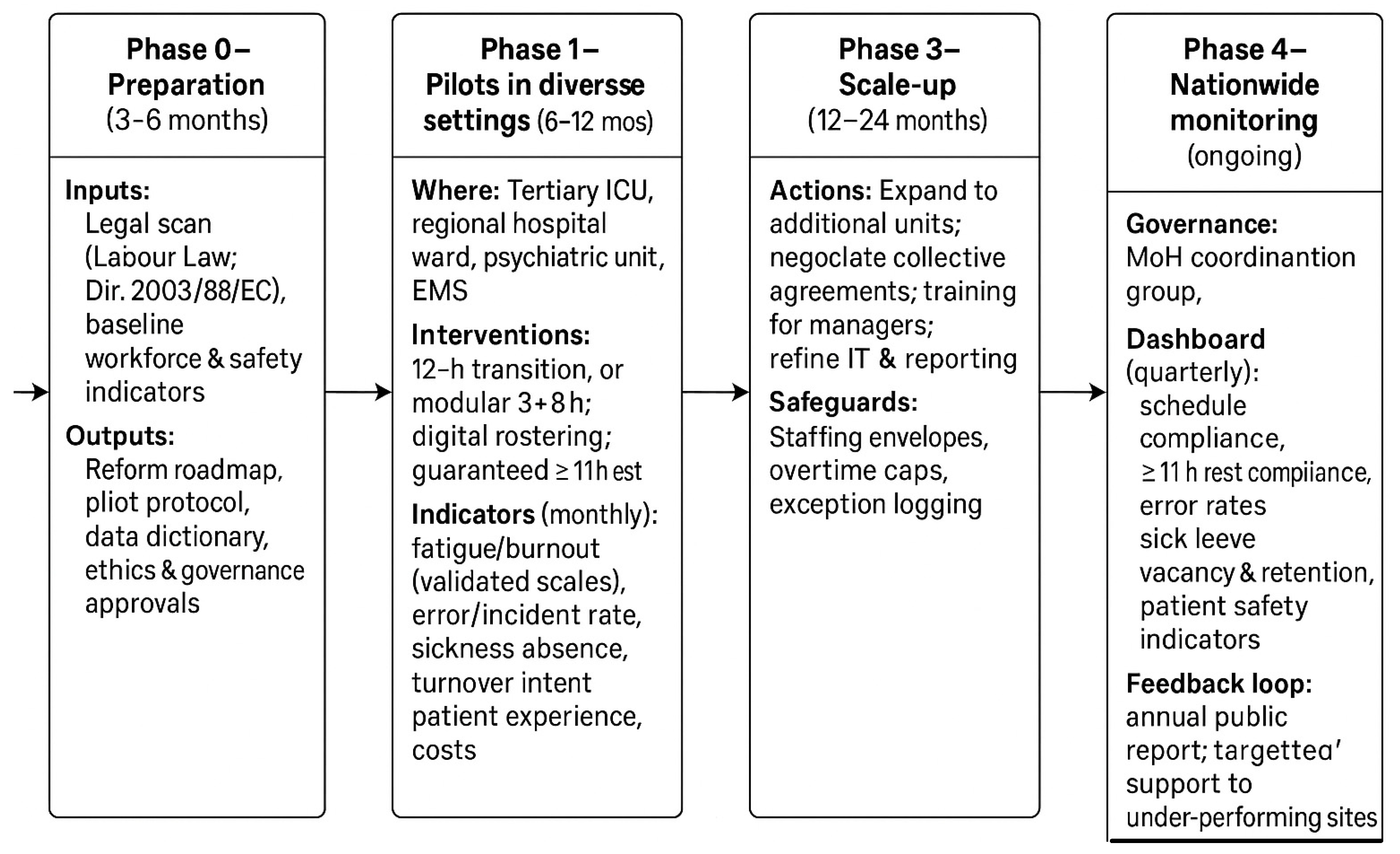 | Sweden | 8–12 h | ≥11 h between shifts | National labour agreements; strong unit-level co-design | ↓ burnout; ↑ retention; ↓ errors |