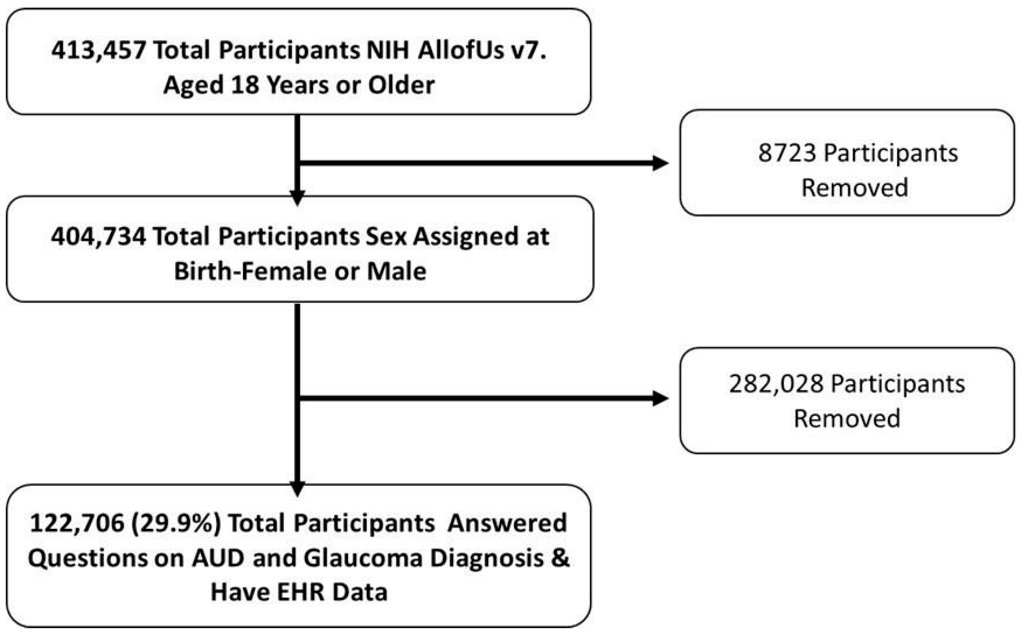 Elghazali, F.; Hughes, A.N.; Wallen, G.R.; Burstein, E.; Barb, J.J. Association Between Alcohol Use Disorder and Glaucoma: Evidence from the National Institutes of Health All of Us Research Program. Int. J. Environ. Res. Public Health 2025, 22, 1738. https://doi.org/10.3390/ijerph22111738