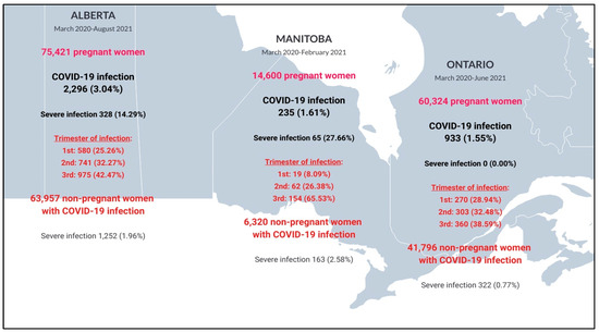 From 28 February 2020 to 31 August 2021, 150,345 Canadian pregnant individuals from Alberta, Manitoba, and Ontario met the inclusion criteria, out of which 3464 had a COVID-19 diagnosis (2.3%); 112,033 non-pregnant women of reproductive age with a COVID-19 diagnosis were also included and considered for comparative purposes. Figure 2 summarizes the selection of pregnant and non-pregnant individuals studied in the three participating provinces, stratified by COVID-19 and COVID-19 severity status. Severe COVID-19 requiring hospitalization was higher in pregnant individuals (n, 393 (11.30%)) compared to non-pregnant people (n, 1737 (1.46%)) (p < 0.01), and this was more marked in Manitoba (Figure 2). There was a higher number of COVID-19 diagnoses during the 3rd trimester of pregnancy in the three provinces, which suggests that systematic testing was performed before delivery (Figure 2).