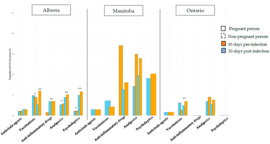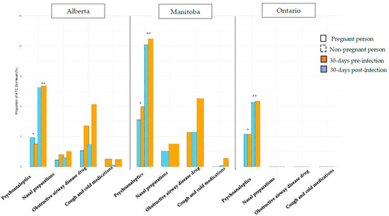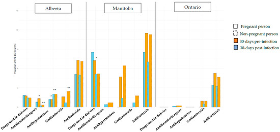 Prevalence of medication prescribed/dispensed in the 30 days pre- and post-COVID-19 positive test/diagnosis among pregnant and non-pregnant women, in Alberta, Manitoba, and Ontario. * p < 0.05 when comparison between pregnant and non-pregnant persons for 30 days pre-infection. ** p < 0.05 when comparison between pregnant and non-pregnant persons for 30 days post-infection.