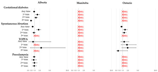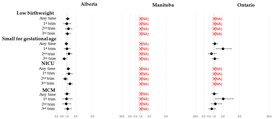 The risk of adverse maternal, pregnancy, and neonatal outcomes associated with COVID-19 during pregnancy and adjusted for potential confounders across Alberta, Manitoba, and Ontario, and stratified by trimester of diagnosis, is presented in Figure 4. Adjusting for potential confounders and trimester of diagnosis, COVID-19 during pregnancy, especially during the first trimester, was associated with an increased risk of spontaneous abortion (p < 0.05) and gestational diabetes (p < 0.05). A signal for an increased risk of prematurity and small for gestational age newborn associated with COVID-19 in the third trimester of pregnancy was observed in Manitoba only (RR 1.80, 95% CI 1.27, 2.56; RR 2.28, 95%CI 1.20, 4.34, respectively). The risk for NICU admission was increased with COVID-19 in the third trimester of pregnancy (p < 0.05). A signal for major malformations associated with COVID-19 during the first trimester of pregnancy was only observed in Ontario (RR 2.08, 95%CI 1.18–3.69) (Figure 4).